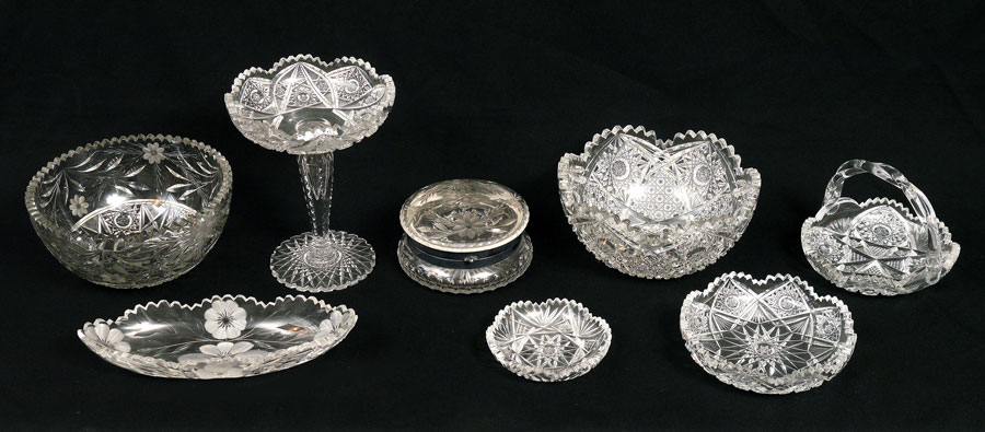 7 PIECE AMERICAN BRILLIANT CUT GLASS: An assembled collection in an array of patterns and shapes to include 1) Large berry bowl, 4 1/4'' h. x 9''. 2) Berry bowl, 4 3/8'' x 9''. 3) Handled basket, 5 1/4'' x 7 1/4''. 4) Low bowl, 7 1/4'' dia. 5) Bon bon, 5 1/4'' dia. 6) Compote on tall stem, 9'' h. x 7 1/4''. 7) Oval relish dish, 11 3/8'' x 4 1/2''.