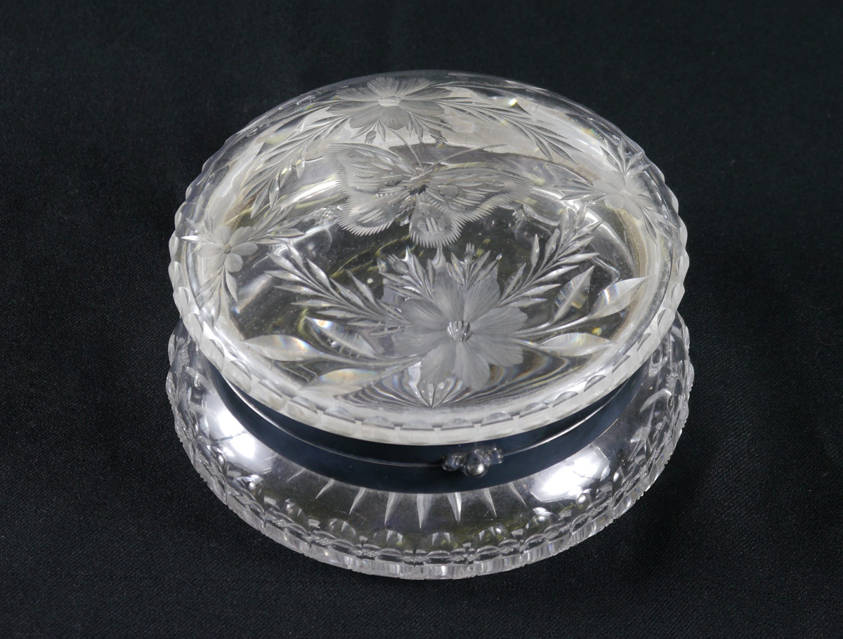 PAIRPOINT CUT GLASS BUTTERFLY POWDER OR DRESSER BOX: Butterfly and floral motif hinged lid, silverplate trim, cut glass base. Unsigned. Measures 3 1/4'' h. x 6 1/8''.