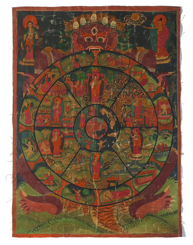 TIBETAN THANGKA: Wheel of Life Central segmented medallion with figures depicting various scenes of life activities including erotic, other decorations with figures and deities. Measures 24 1/2'' x 18''. Actual age unknown.