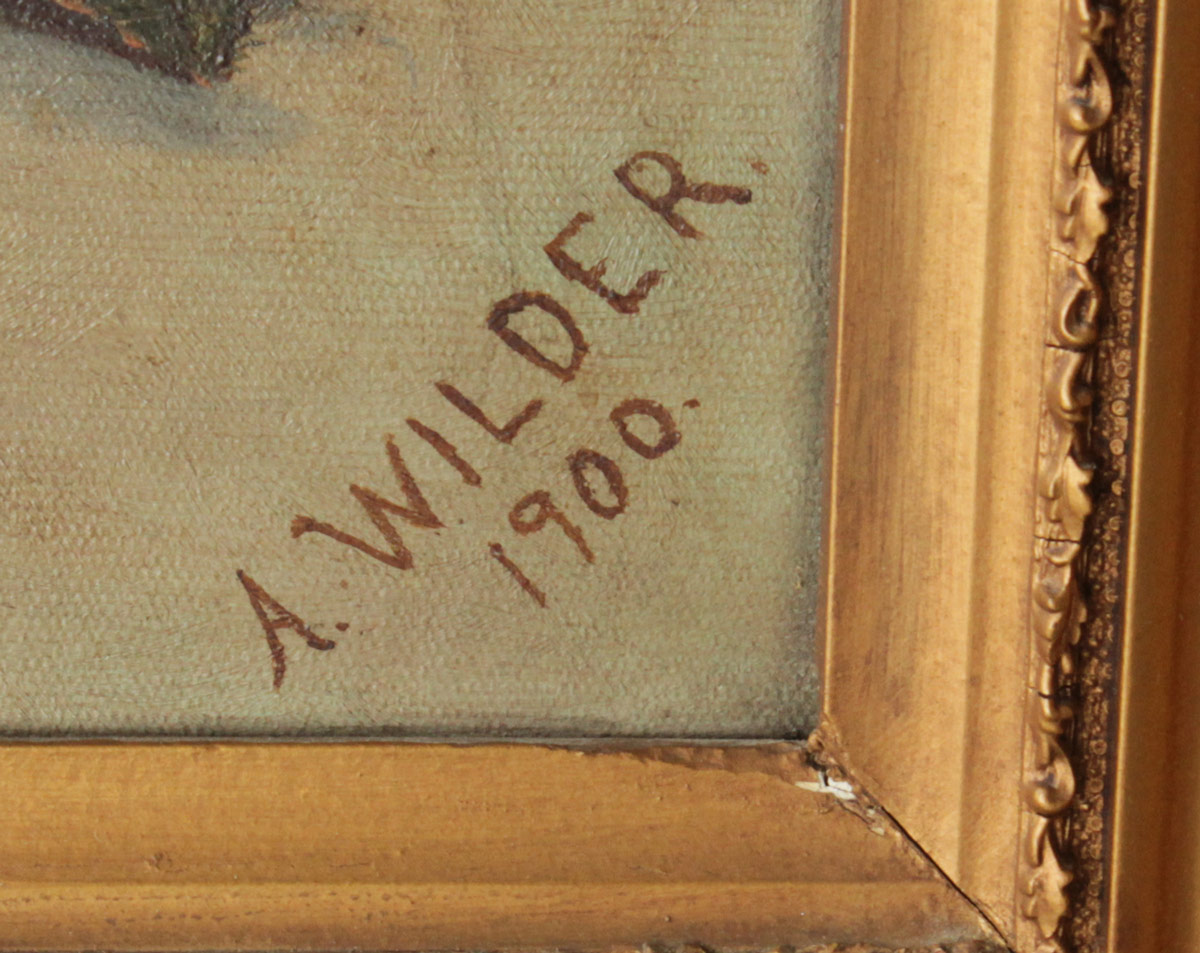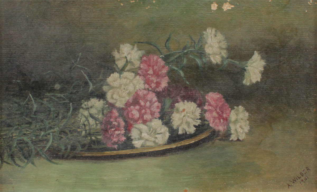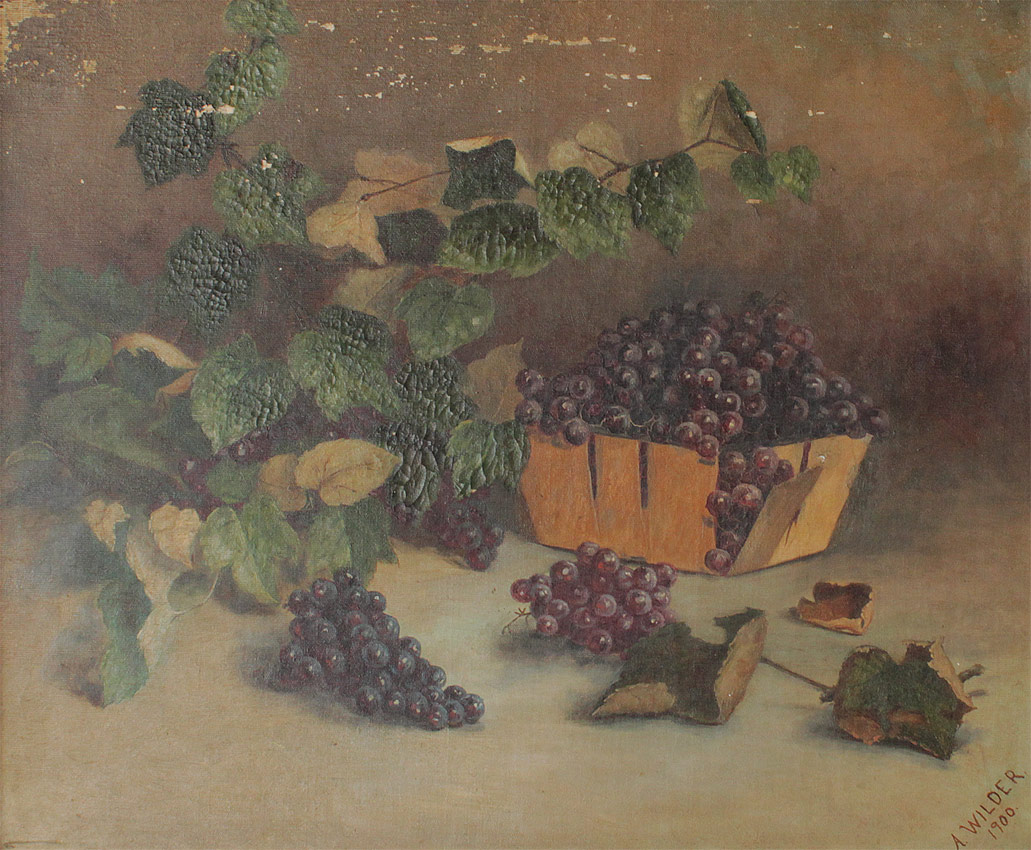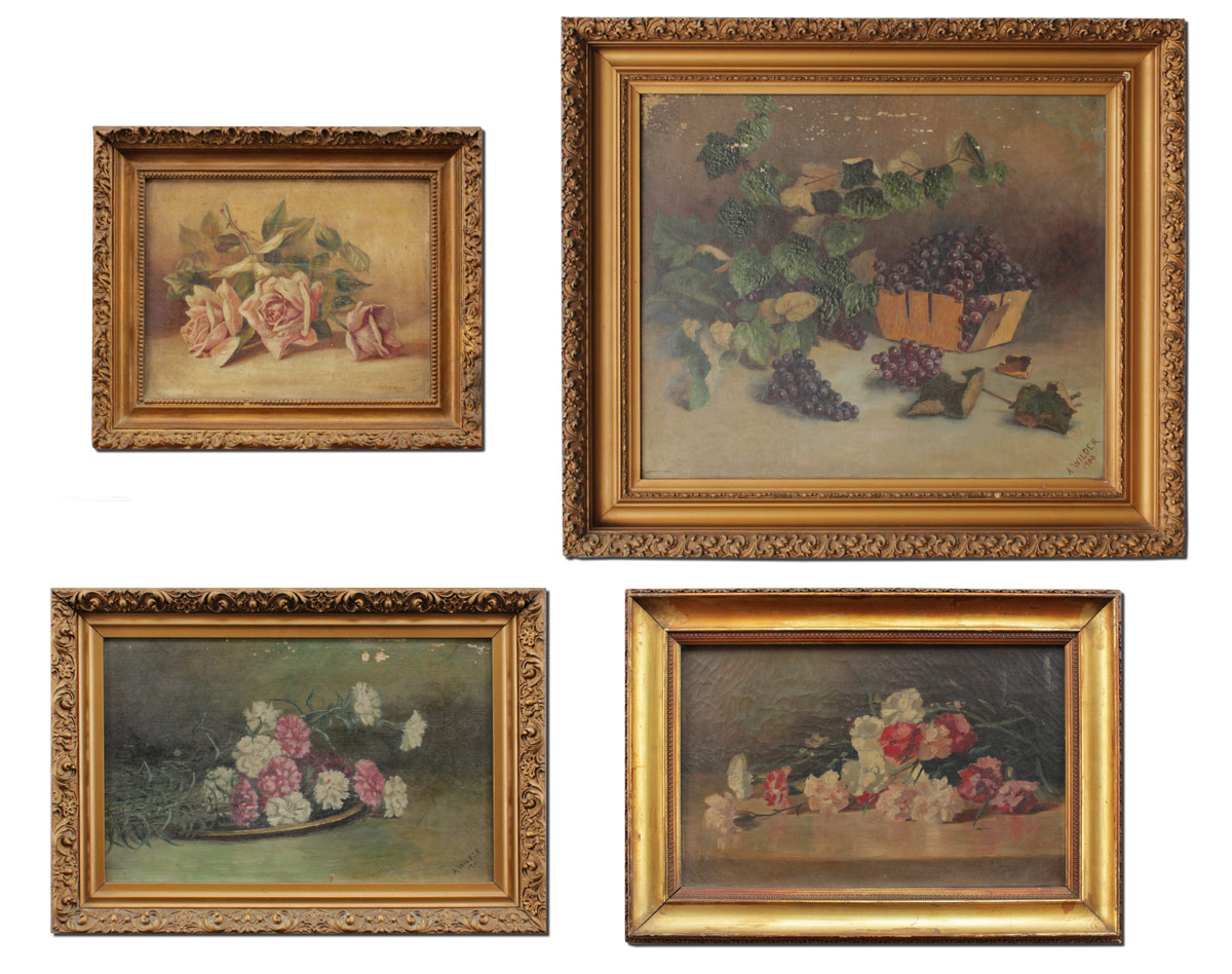 WILDER, Alleen, (American, 19th/20th Century): 4 Piece Floral Still Life Lot to include; 1) Large Oil/Canvas, Study of Grapes, 25'' x 29 3/4'', signed lower right, dated 1900, encased in period molding with wear and older paint, 33'' x 38 1/2''. 2) Still Life of Roses, Oil/Canvas, 10'' x 13'', signed lower right, marked copy, period frame 13 1/2'' x 16 1/2''. 3) Still Life of Carnations, Oil/Canvas, 12 1/4'' x 19'', signed lower right, dated 1901, gilded frame with overpaint and wear, 15 1/2'' x 23''. 4) Still Life of Carnations, After Proyser, 12'' x 19'', signed lower right, marked After Proyser, period gilded frame with wear, 17 1/2'' x 24''.