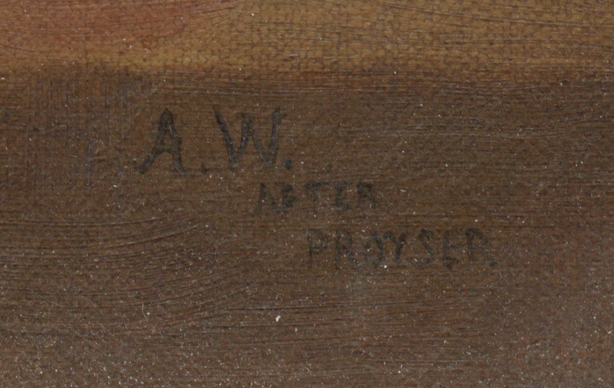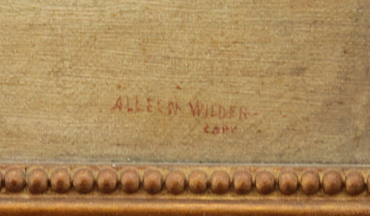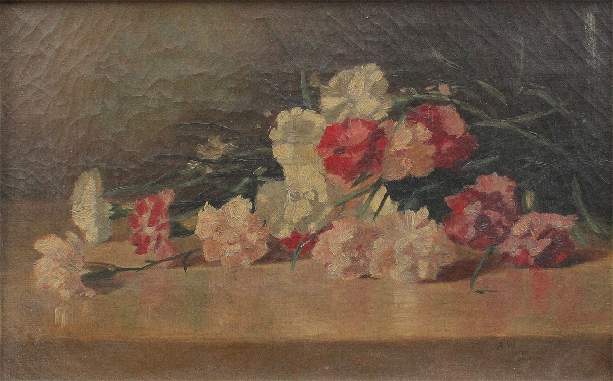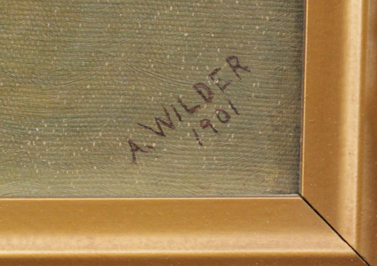 WILDER, Alleen, (American, 19th/20th Century): 4 Piece Floral Still Life Lot to include; 1) Large Oil/Canvas, Study of Grapes, 25'' x 29 3/4'', signed lower right, dated 1900, encased in period molding with wear and older paint, 33'' x 38 1/2''. 2) Still Life of Roses, Oil/Canvas, 10'' x 13'', signed lower right, marked copy, period frame 13 1/2'' x 16 1/2''. 3) Still Life of Carnations, Oil/Canvas, 12 1/4'' x 19'', signed lower right, dated 1901, gilded frame with overpaint and wear, 15 1/2'' x 23''. 4) Still Life of Carnations, After Proyser, 12'' x 19'', signed lower right, marked After Proyser, period gilded frame with wear, 17 1/2'' x 24''.