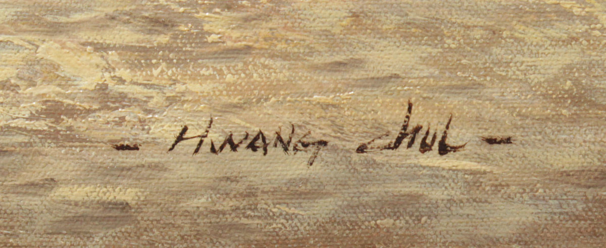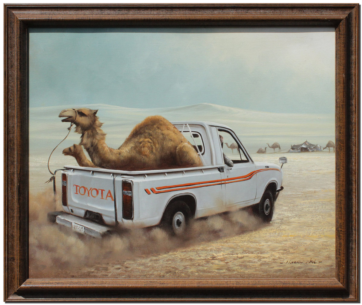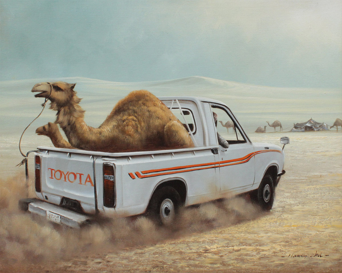 CHEOL HWANG, (Korean, 1971- ): Unusual Arabian Desert Scene with Toyota Pick-up Truck and Camels Nearing an Encampment, Oil/Canvas, 20'' x 24'', signed lower right, authenticity verified by the Artist, encased in wooden frame 23 1/4'' x 27 1/2''.