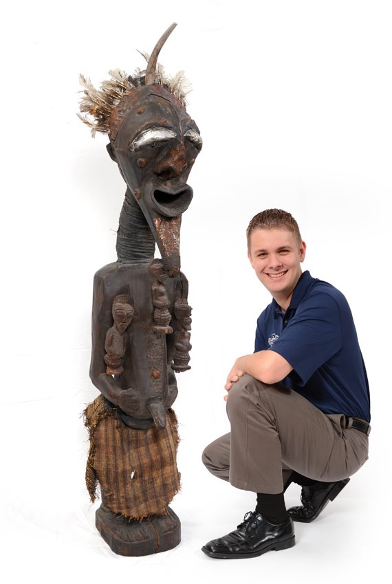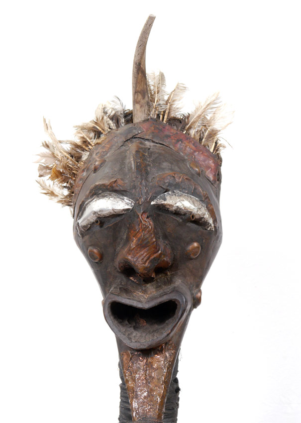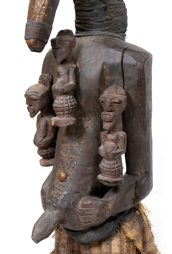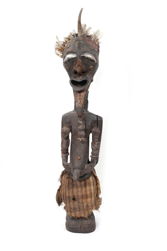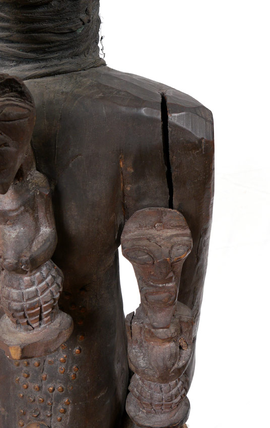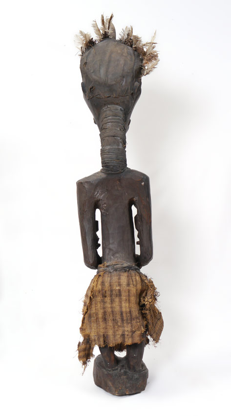 AFRICAN CARVED SONGYE POWER OR FETISH FIGURE: Carved power or fetish figure, Songye People, Democratic Republic of Congo. Applied horn, feather, metal strips, and cloth skirt. Overall measures 65'' h. x 13'' x 14 1/4''.