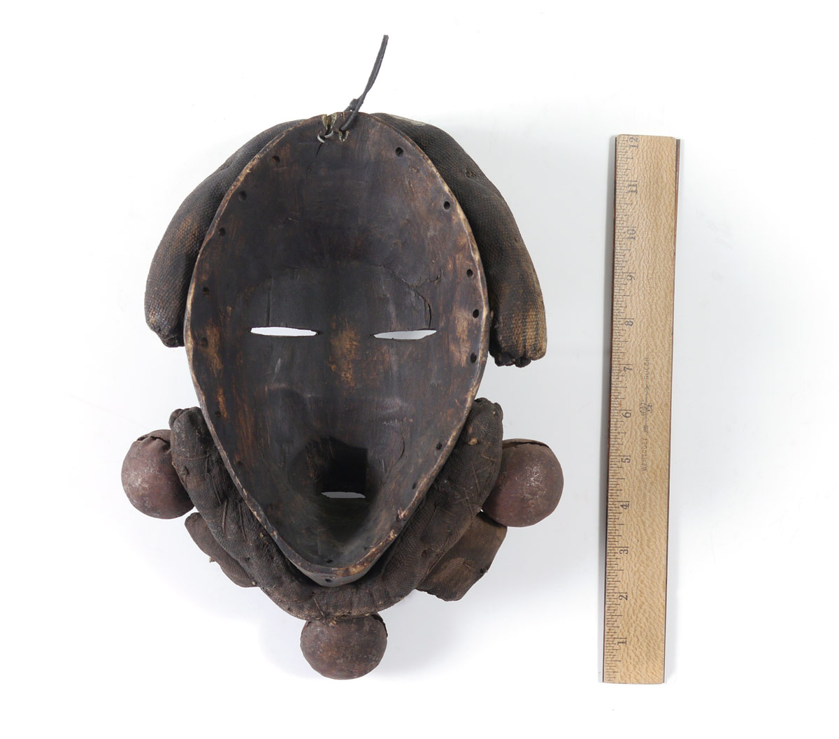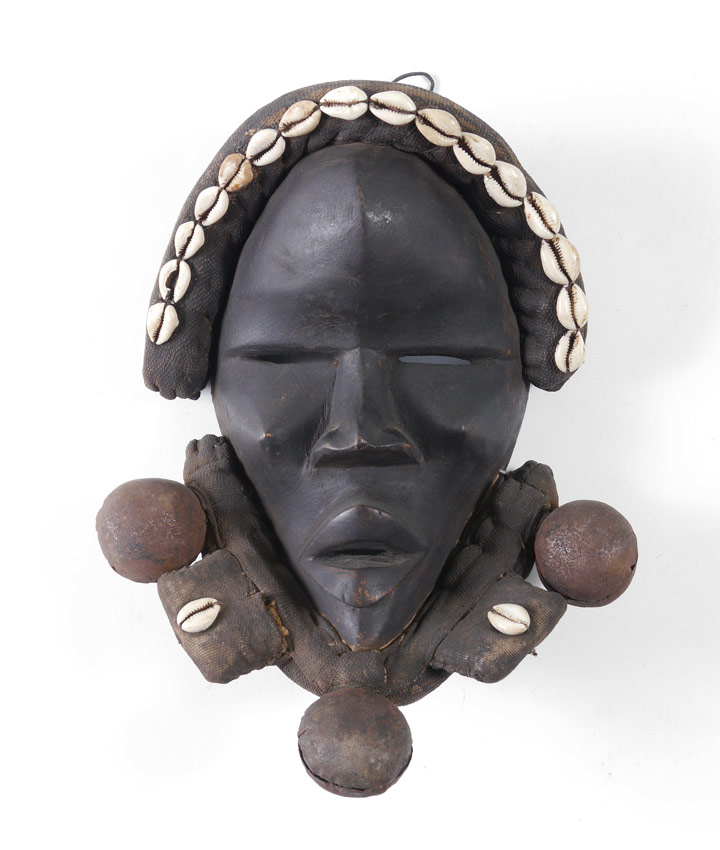 CARVED AFRICAN DEANGLE MASK: Deangle Mask, Dan Tribe, Ivory Coast and Liberia. Carved with inset shells, cloth ''beard'' with applied shells. 12'' h. x 9 1/2'' x 4 1/2''.