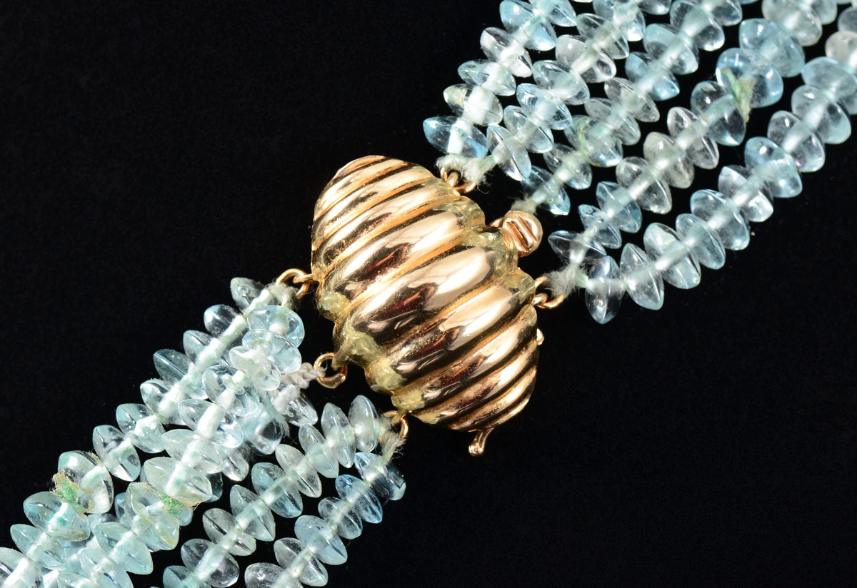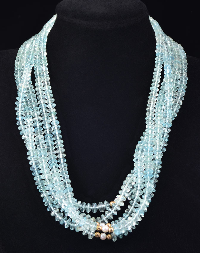 450 CTW AQUAMARINE BEAD TORSADE NECKLACE: Five strands of rondelle shaped aquamarine beads totaling approx. 450. Cts. 14K clasp and ball spacers with cultured pearls. Length approx. 16''. Gold weight: 3.0 grams approx.