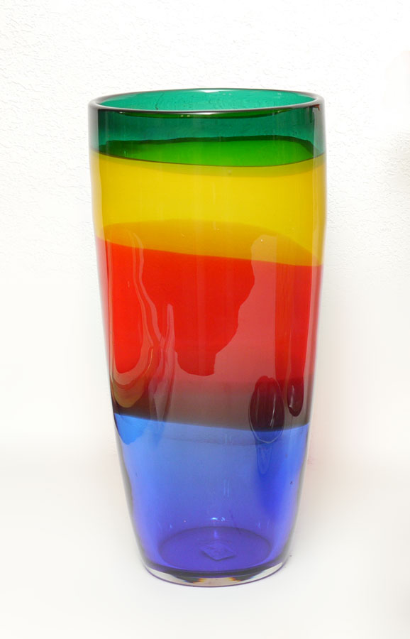 PUCCINI TALL MURANO GLASS BAND VASE: Body formed from four-colored bands of glass by Puccini Glass of Murano, original factory label affixed to bottom. 14 1/4'' h. x 6 3/4''.