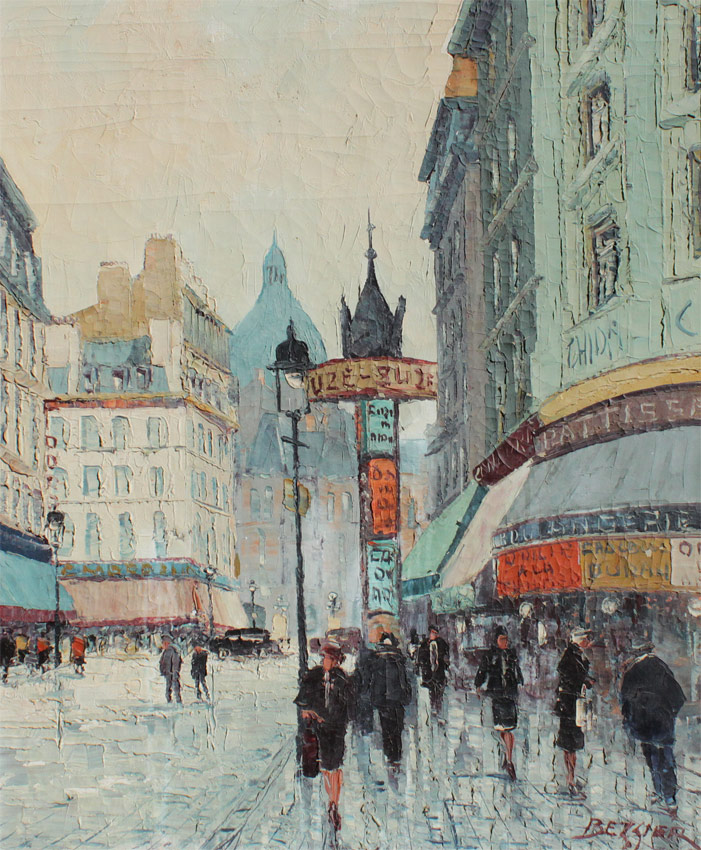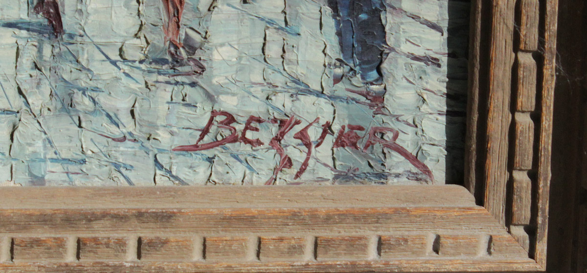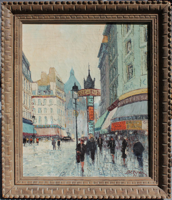 PARISIAN STREET SCENE PAINTING SIGNED BESSIER: Oil/Canvas, 24'' x 20'', signed lower right, encased in period painted and carved frame with wear 29 1/2'' x 25 1/4''.