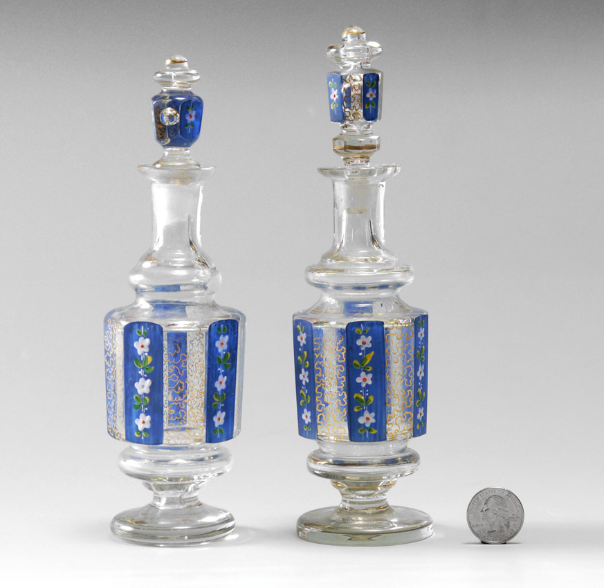 PAIR MOSER QUALITY ENAMELED BOTTLES: A taller and smaller bottle with enamel and gilt decoration in the manner of Moser. Each with stopper, unsigned. Taller measures 8 1/2'' h. x 2 1/4''.