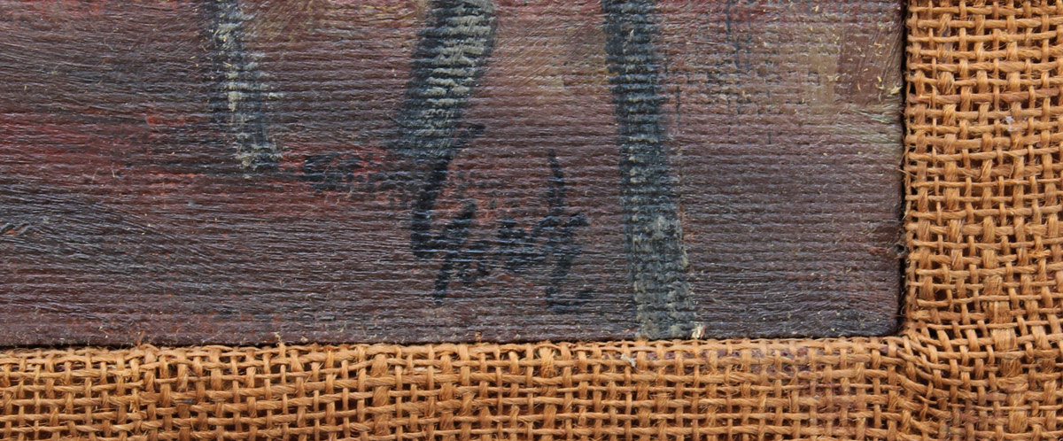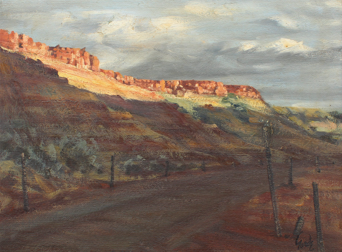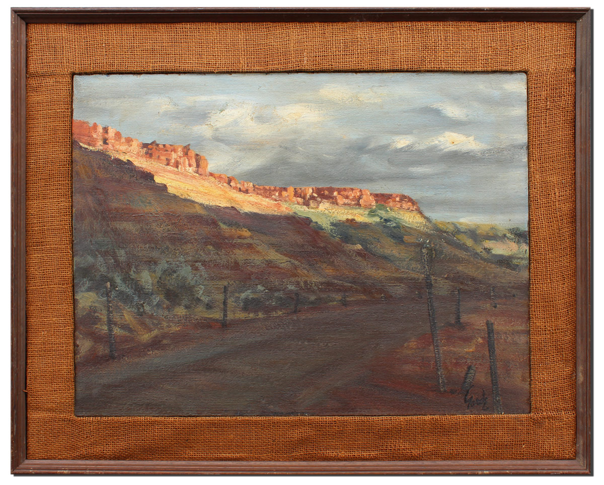 ILLEGIBLY SIGNED DESERT ROAD LANDSCAPE PAINTING: Oil/Masonite, signed lower right Garde?, Sight size 18'' x 24'', frame with wear 25'' x 31''.
