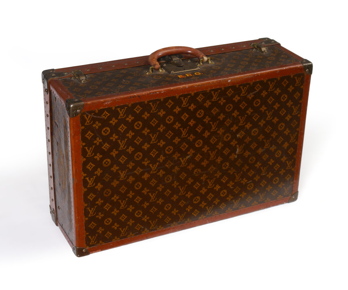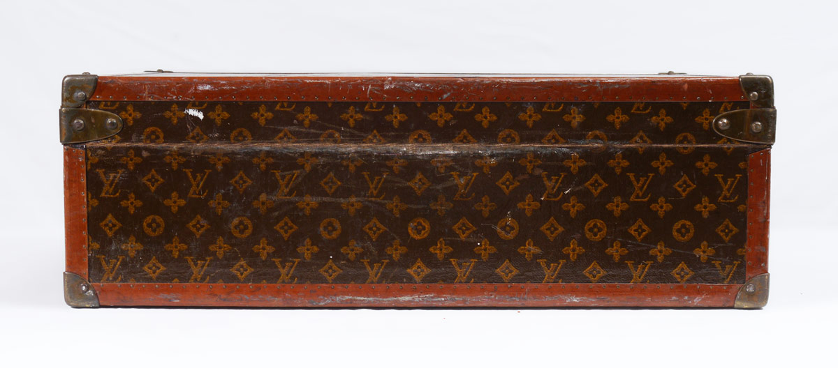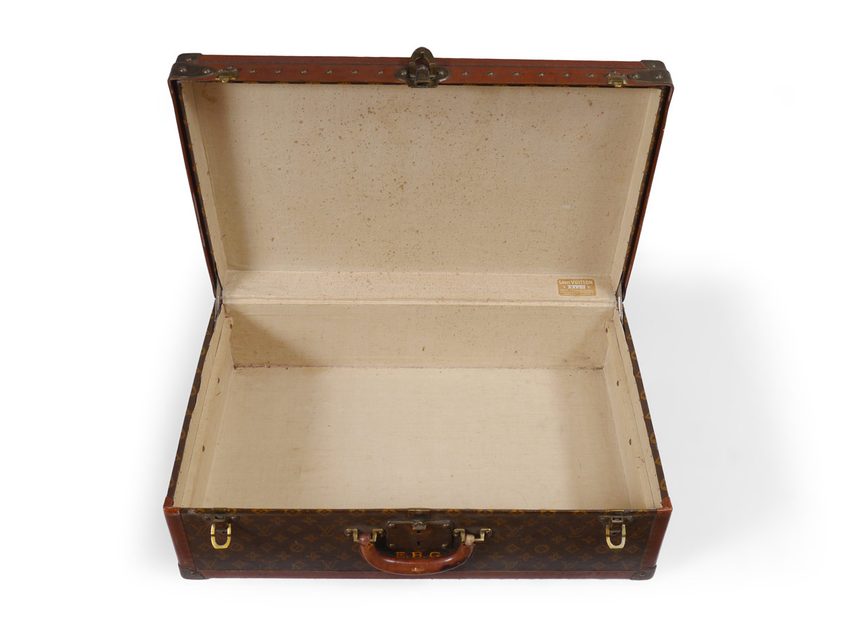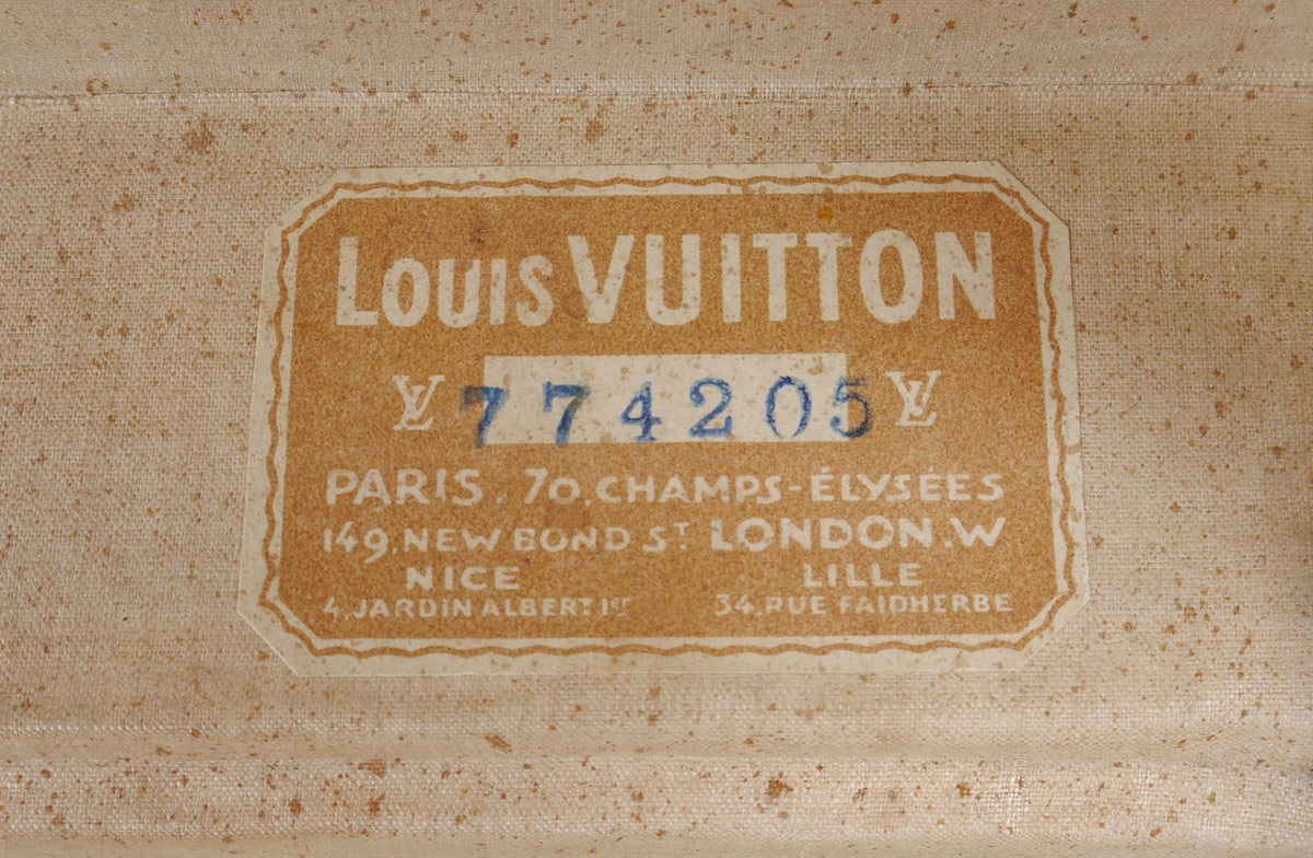 VINTAGE LOUIS VUITTON HARD SUITCASE: Leather bound hard sided suitcase. Well marked hardware. The interior tag is numbered 774205. Measures approx. 16 1/2'' x 26'' x 8 3/4''.