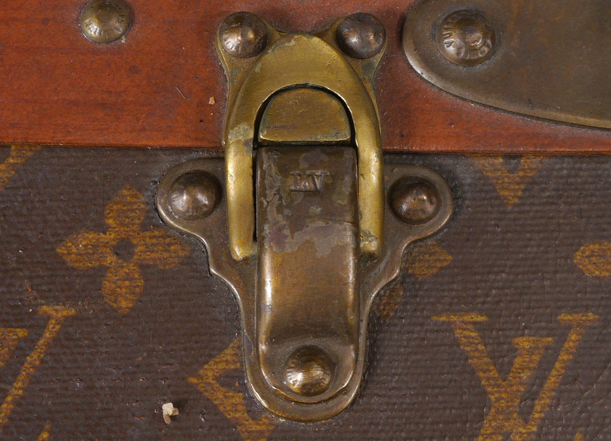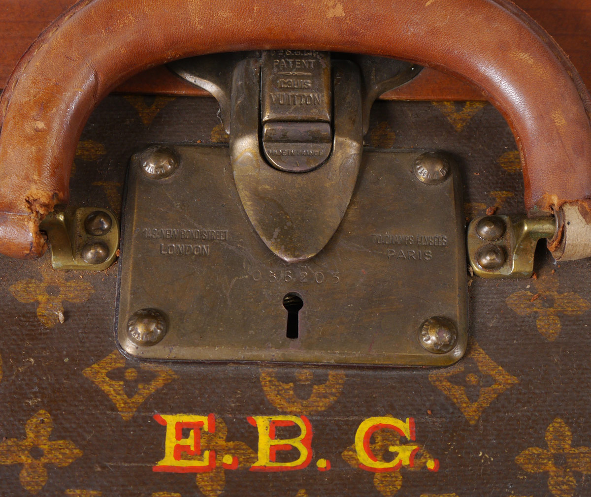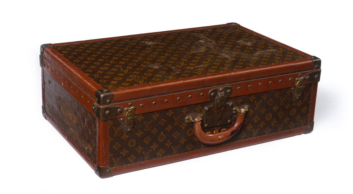 VINTAGE LOUIS VUITTON HARD SUITCASE: Leather bound hard sided suitcase. Well marked hardware. The interior tag is numbered 774205. Measures approx. 16 1/2'' x 26'' x 8 3/4''.