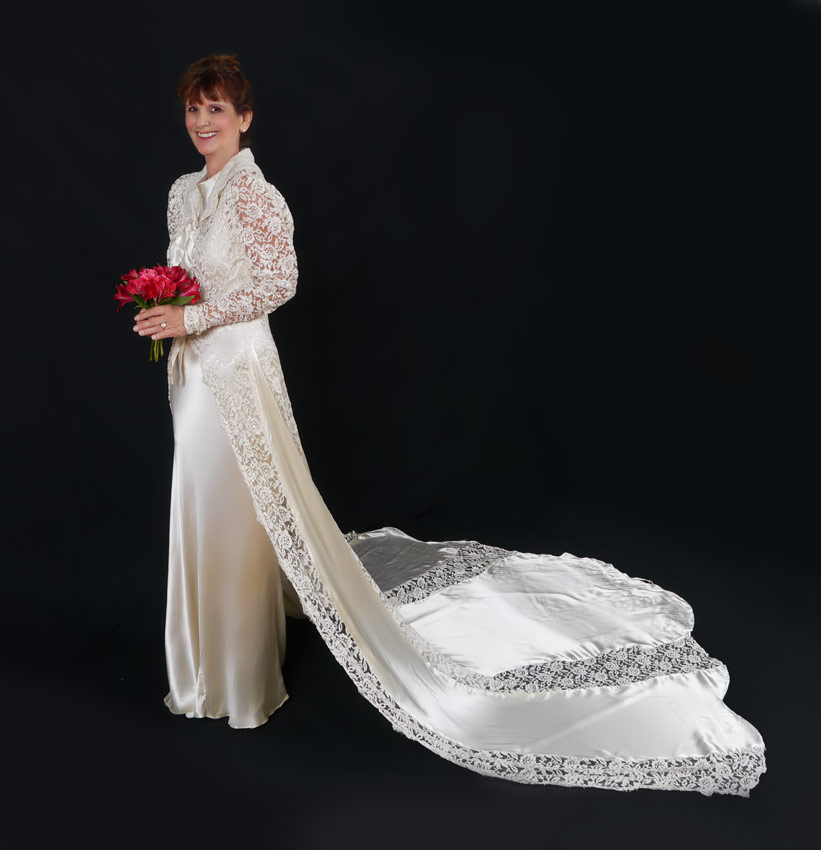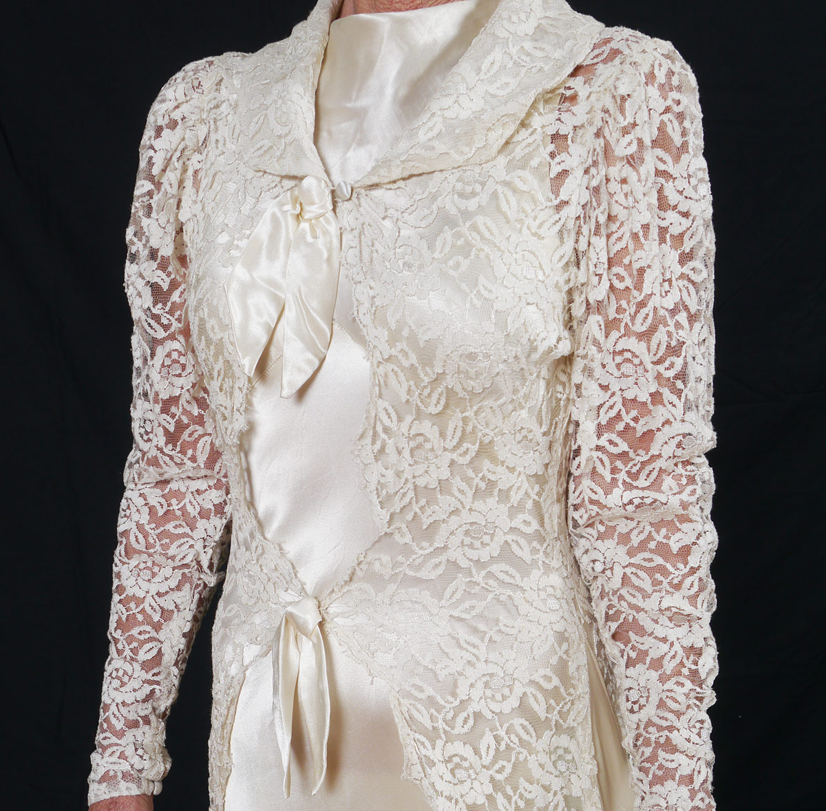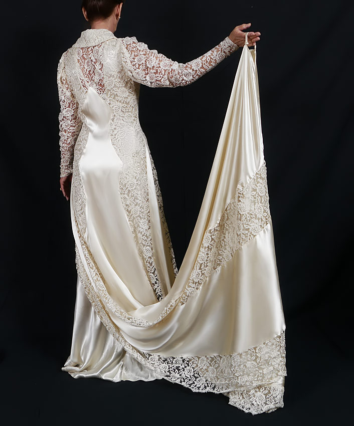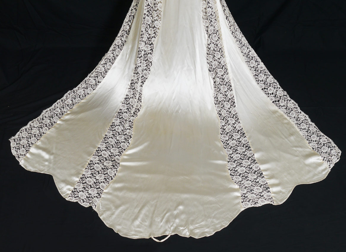 SATIN AND LACE WEDDING DRESS Ca. 1910-1920s: Two part satin sheath dress slip worn alone or under the silk lace and satin coat with cathedral length 6 ft. train. Small size.