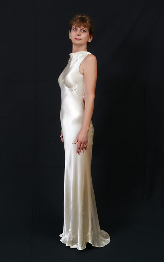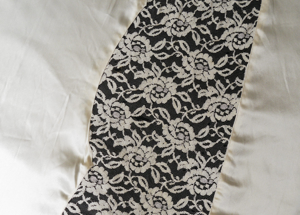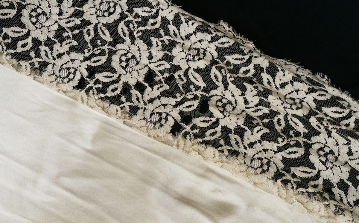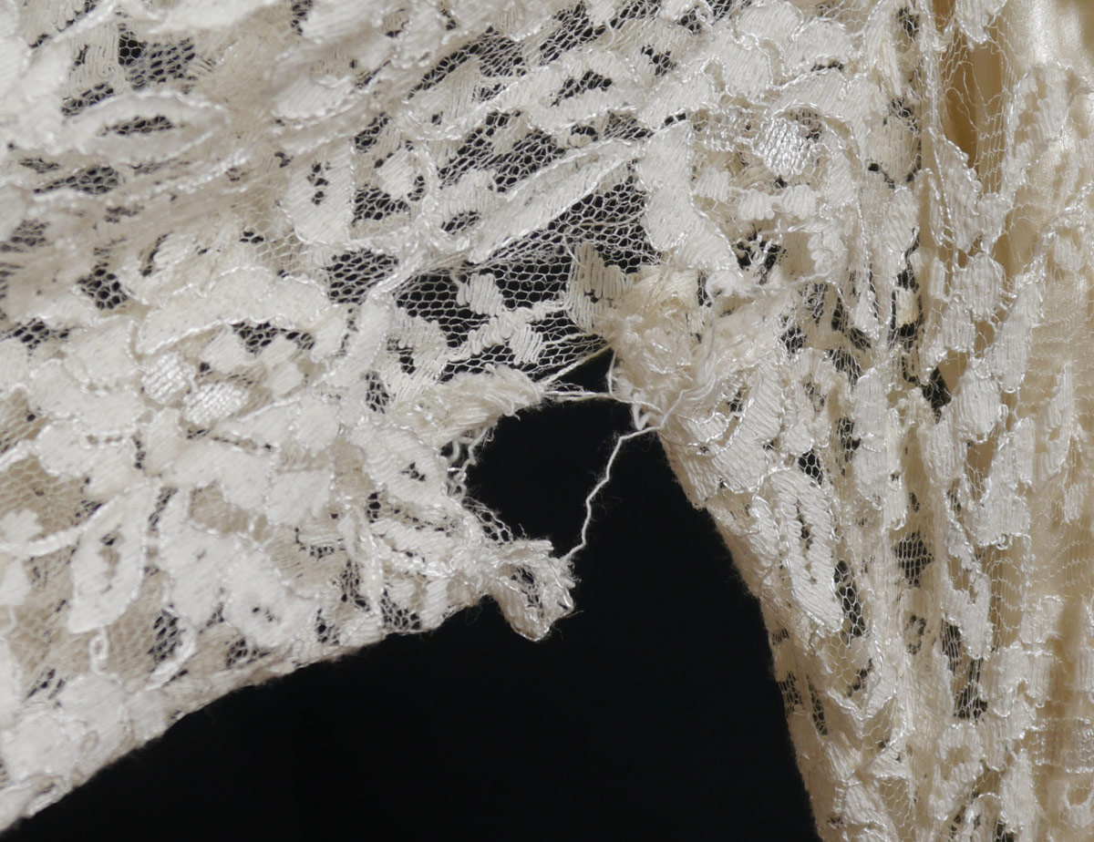 SATIN AND LACE WEDDING DRESS Ca. 1910-1920s: Two part satin sheath dress slip worn alone or under the silk lace and satin coat with cathedral length 6 ft. train. Small size.