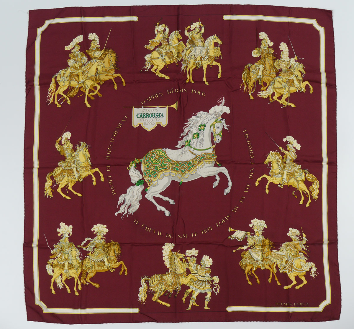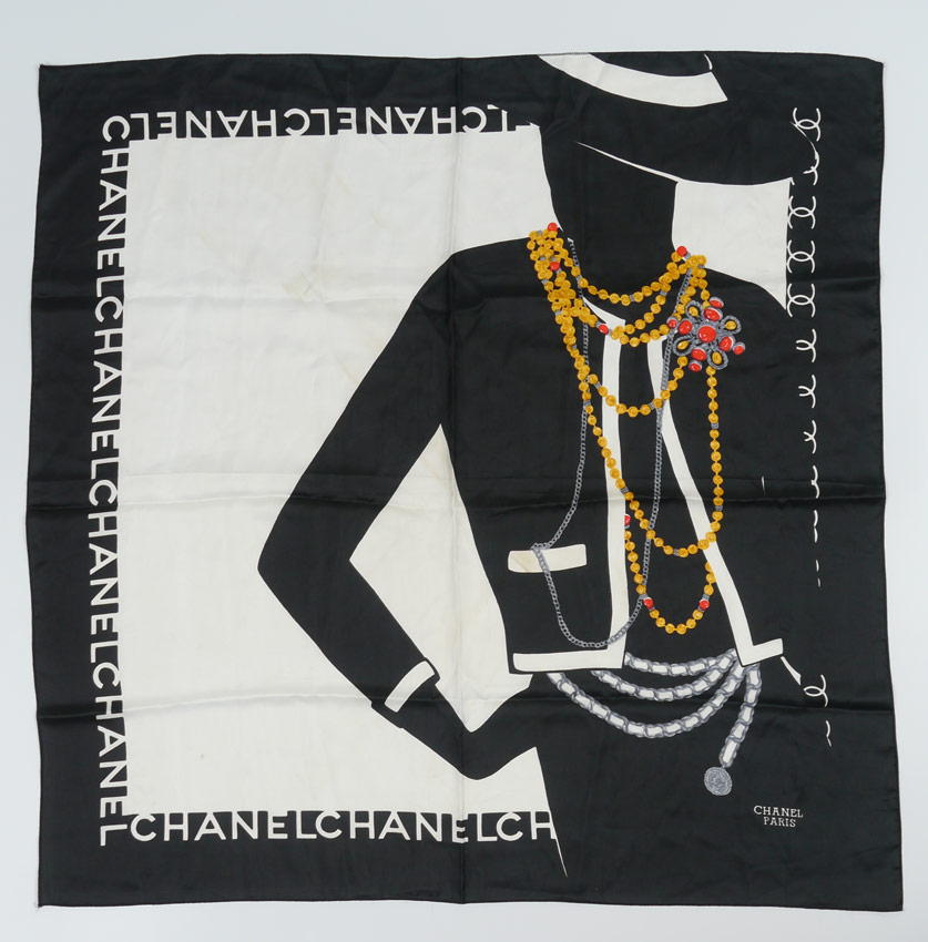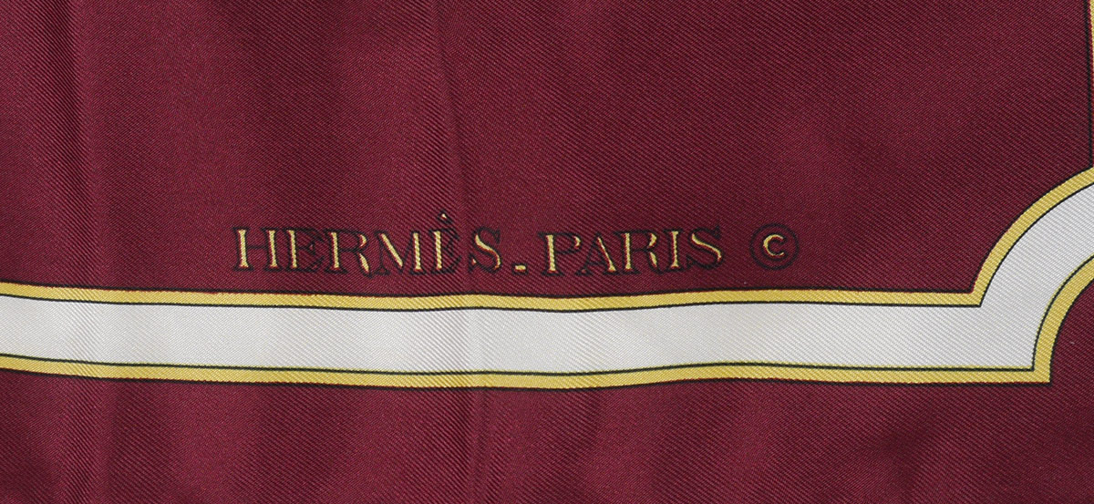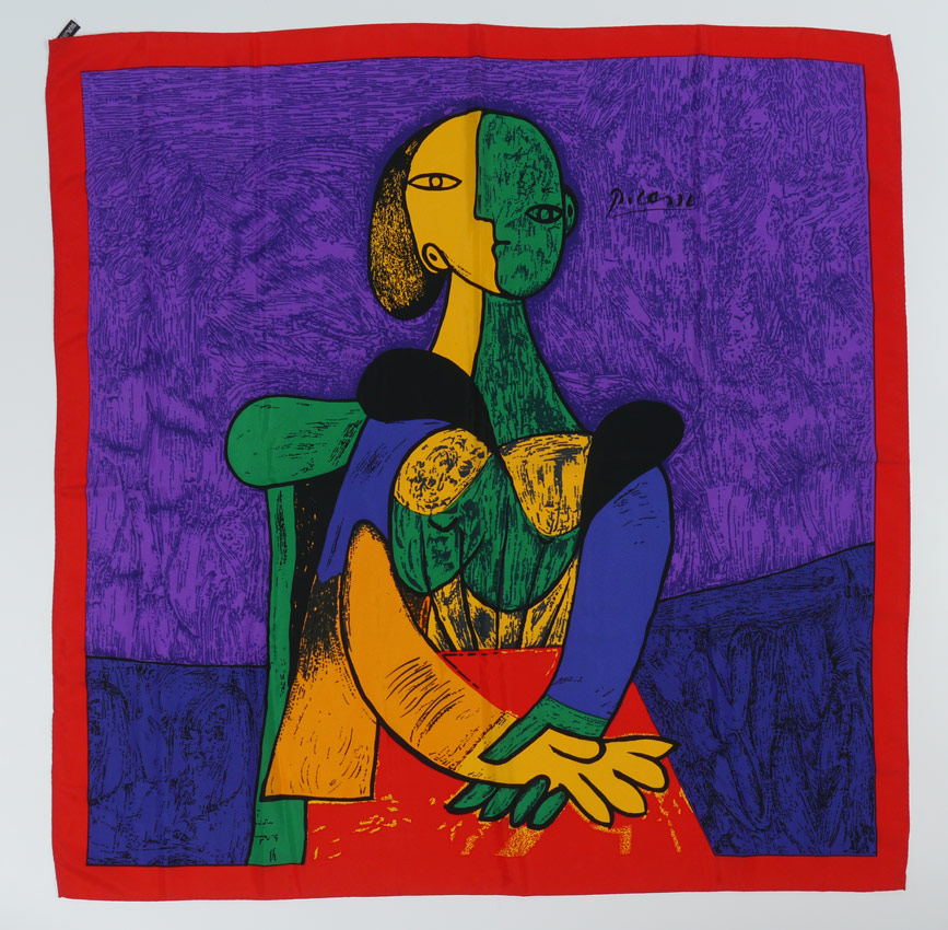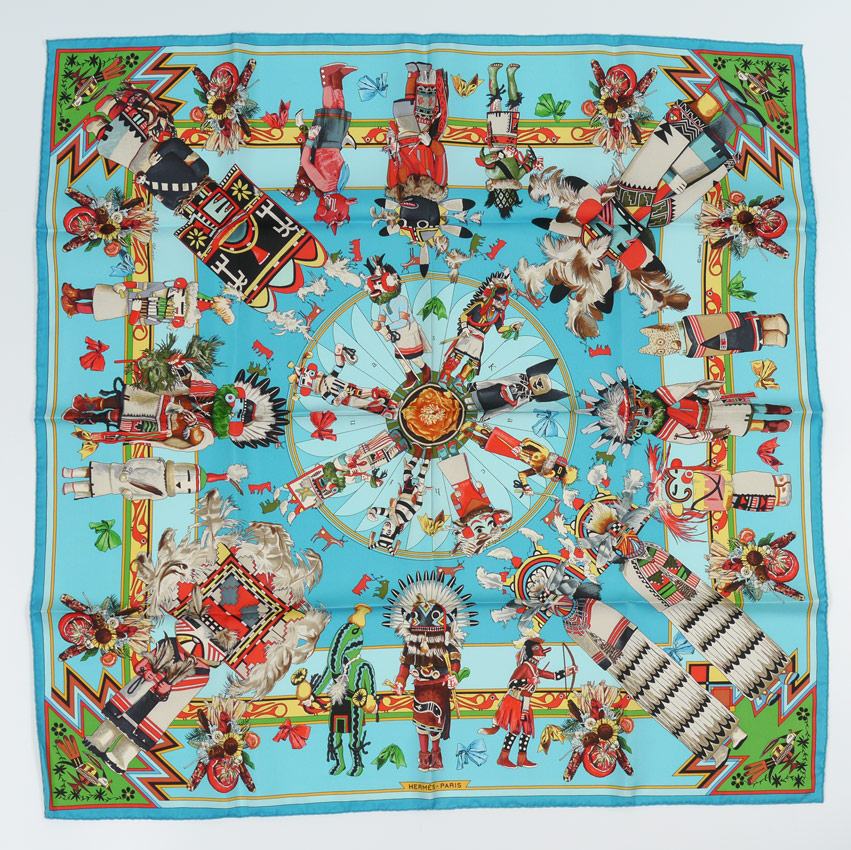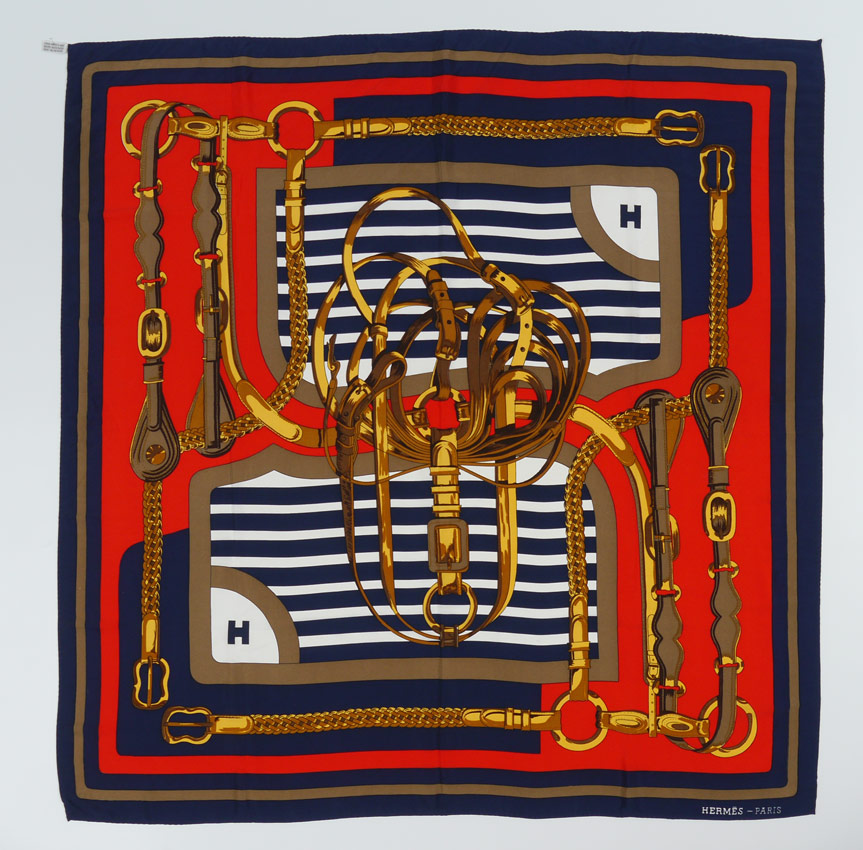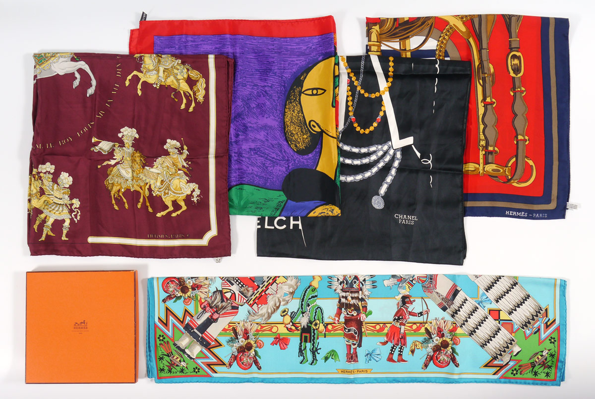 5 DESIGNER SCARVES INCL. HERMES: 5 pieces total to include 1) Hermes with a horse's bridle motif, approx. 34'' square. 2) Hermes, burgundy ground, horse motif, approx. 35'' square. 3) Hermes, turquoise ground, Southwest Kachina design, approx. 35'' square, sold with original box. 4) Chanel, black ground with figural woman wearing jewelry design, approx. 34'' square. 5) Picasso, purple ground, seated woman design, approx. 34 1/2'' square.