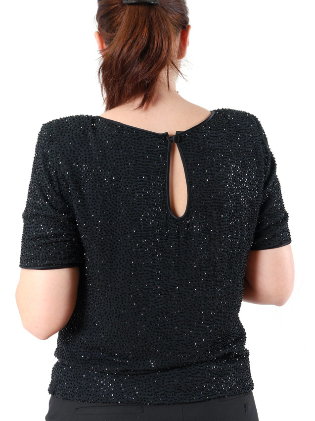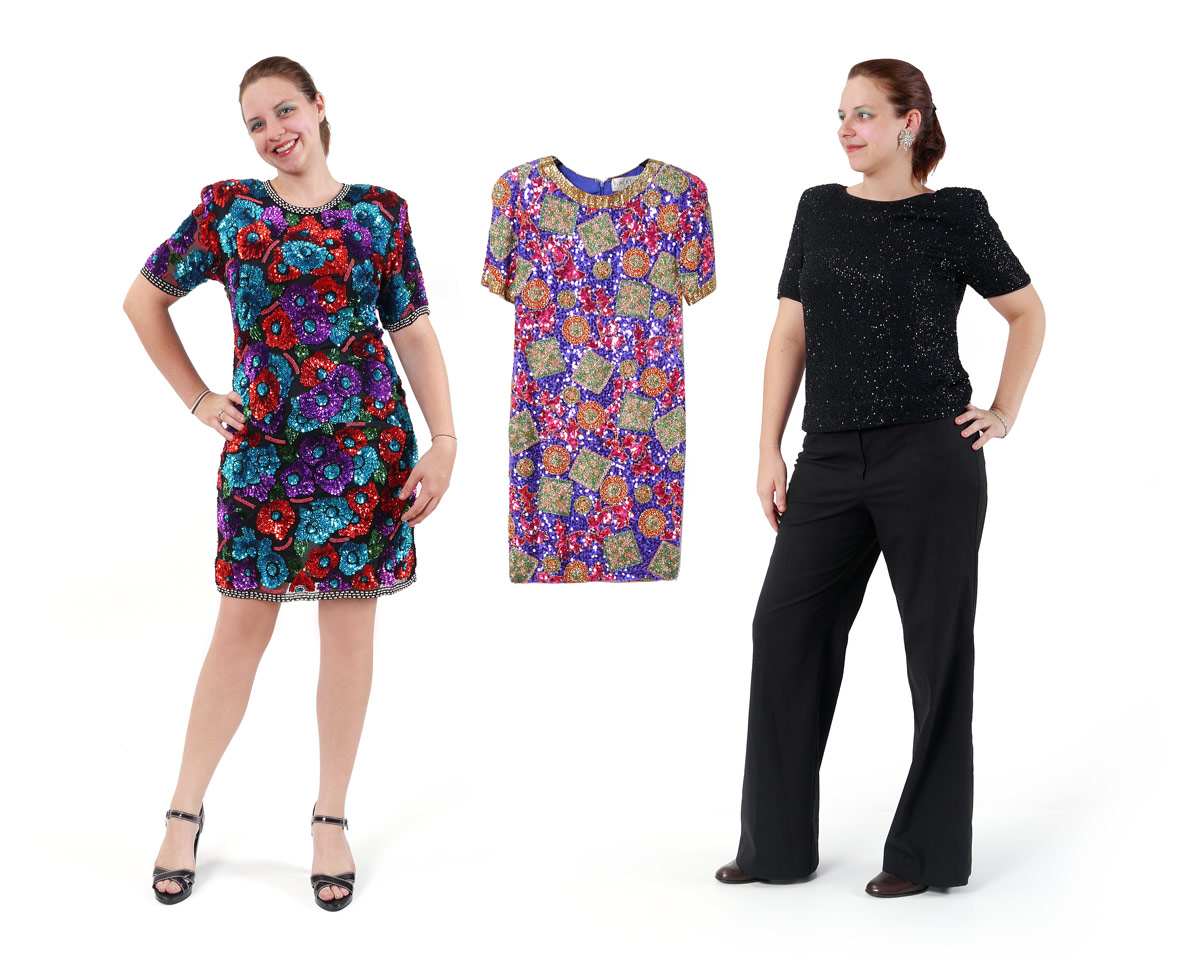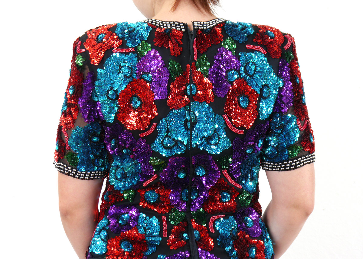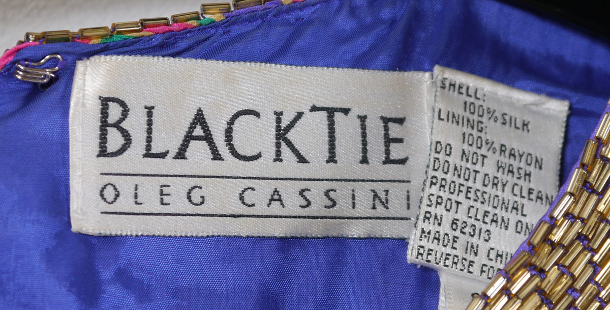 OLEG CASSINI BLACK TIE DRESS AND TOP: 3 piece group to include a festive Oleg Cassini sequin and beaded dress. The dress measures 37'' collar to hem and 17'' shoulder to shoulder. The black beaded top is also Oleg Cassini Black Tie. Sold with an unlabeled bead and sequin cocktail dress. All are a small/medium size.