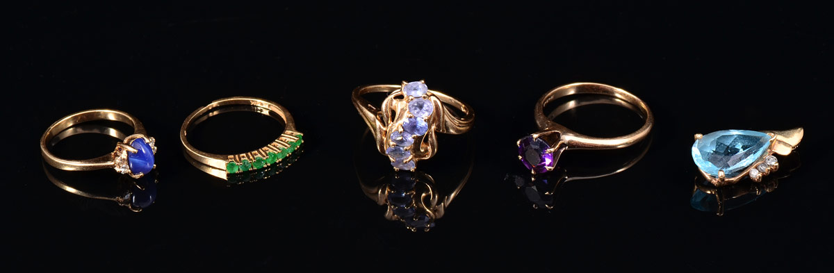 5 PIECE ESTATE 14K GOLD RINGS & PENDANT: 1) 5 Ct blue topaz and diamond pendant. 2) Linde star sapphire and diamond ring, size 4. 3) .25 Ctw Emerald band, size 6. 4) Tiffany set purple stone ring, size 7.25. 5) 1.50 Ctw tanzanite ring, size 8. Weight: 10.9 grams.