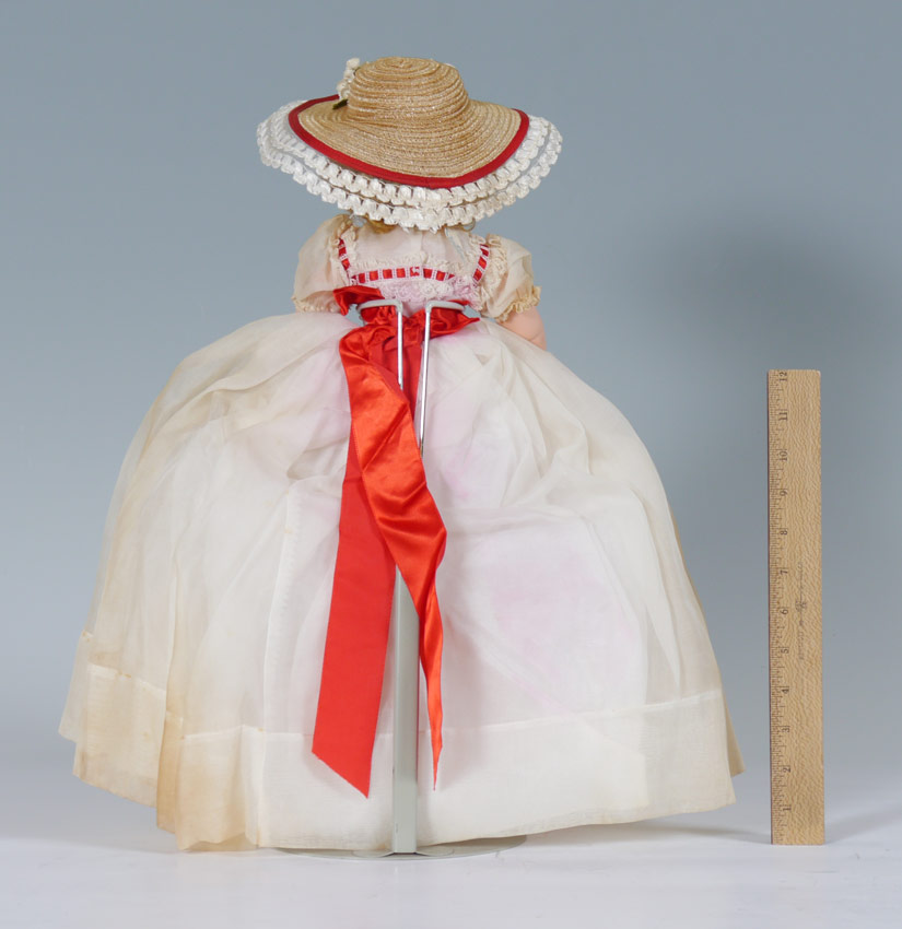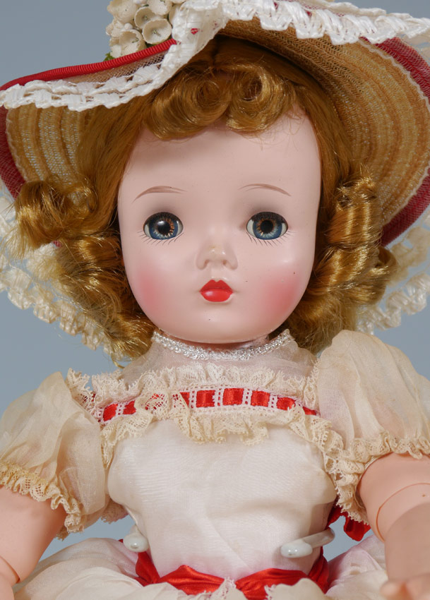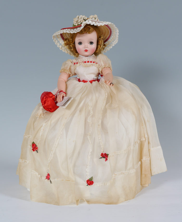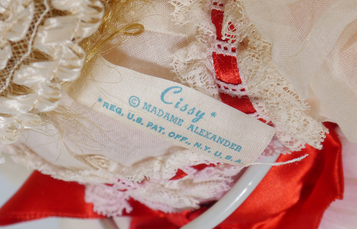 CA. 1955 MADAME ALEXANDER CISSY DOLL: All original. Hard plastic head on softer vinyl body. Greenish hazel sleepy eyes with lashes, pouty red mouth, blonde hair. Her bonnet, gown, purse, ring on her finger, under garments, stockings with seam, and shoes are all original. The gown bears the Cissy tag. Madame Alexander paper tag is on her wrist. Approx. 19'' tall.