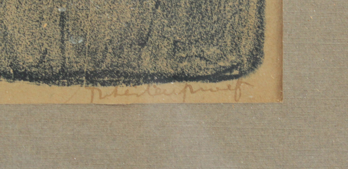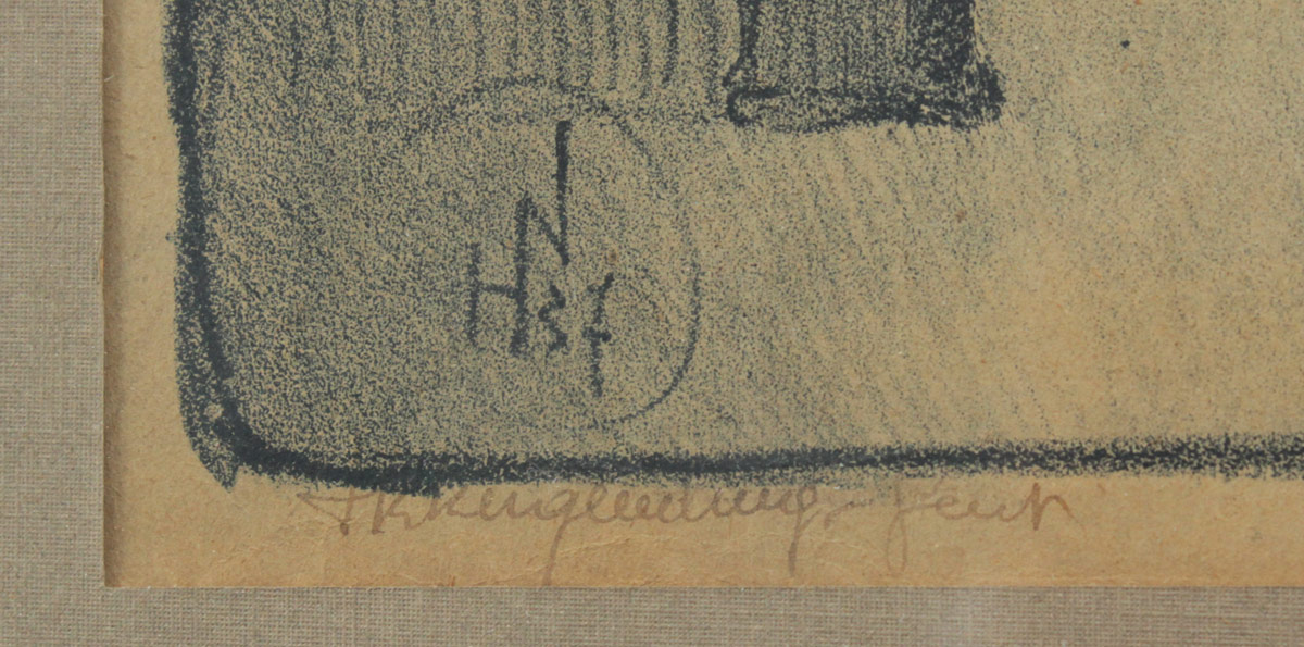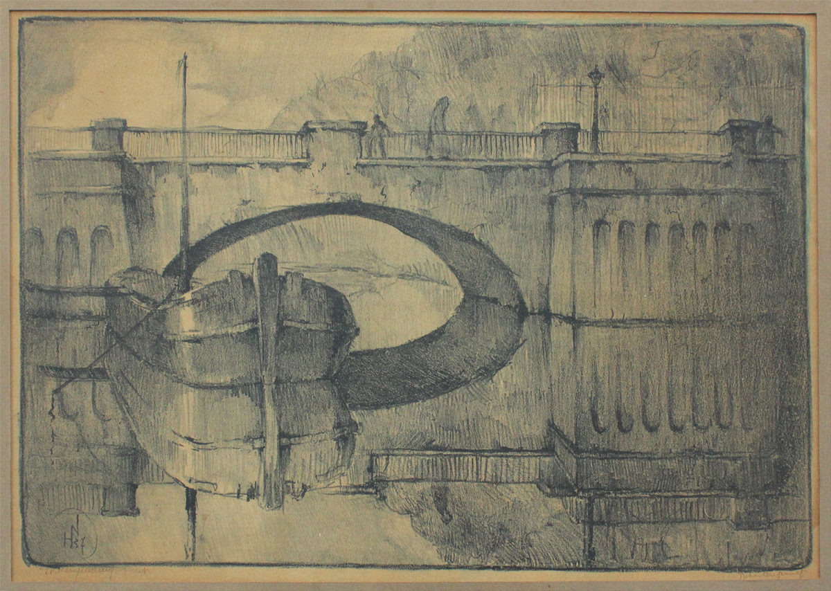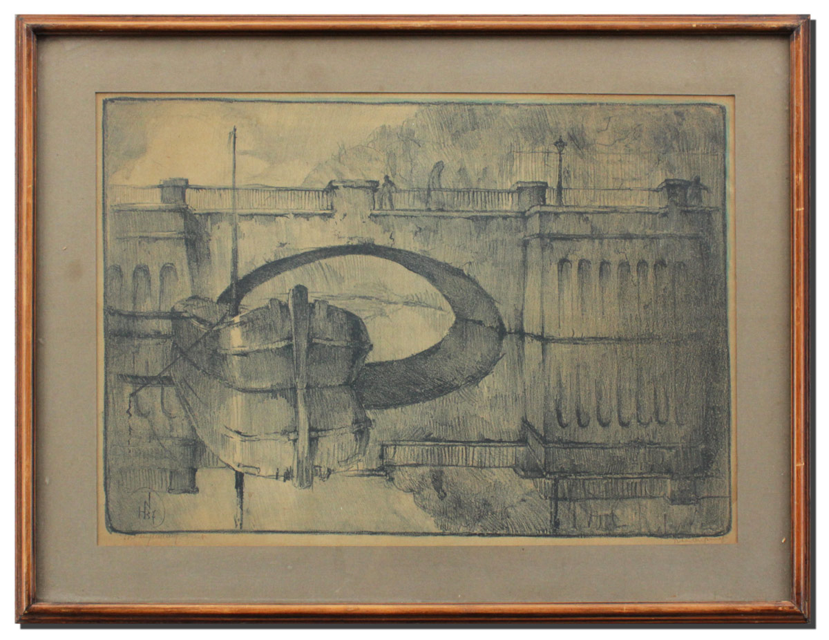 ILLEGIBLY SIGNED CANAL SCENE LITHOGRAPH DATED 1937: Probably Paris on the Seine with Figures on bridge, Sight size 13'' x 18 3/4'', indiscernible markings in the lower left and right hand corner with the artist's monogram H.N. ? and the date '37 in the lower left hand corner plate, wooden frame with wear 17 1/2'' x 23 1/2''.