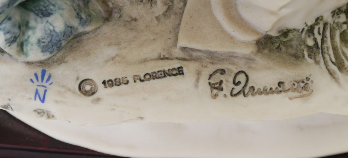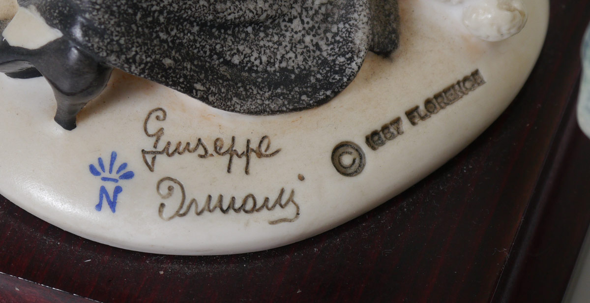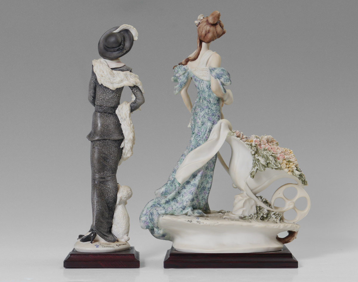 2 GIUSEPPE ARMANI FLORENCE SCULTURE d'ARTE FIGURINES: 1) ''Flowers for Sale'' #1119C, lovely colorful sculpture, approx. 14 1/4''h. x 9 3/4'' x 5 1/4''. 2) ''Lady with Poodle'' #0394C, 13 3/4''h. x 4'' x 4 1/4''.