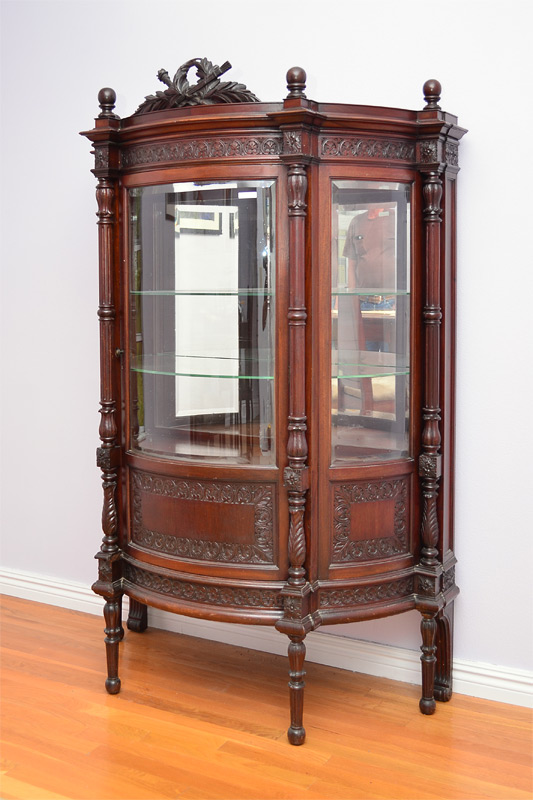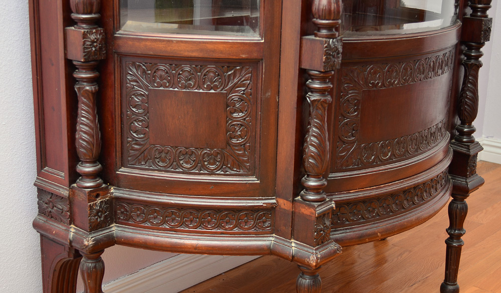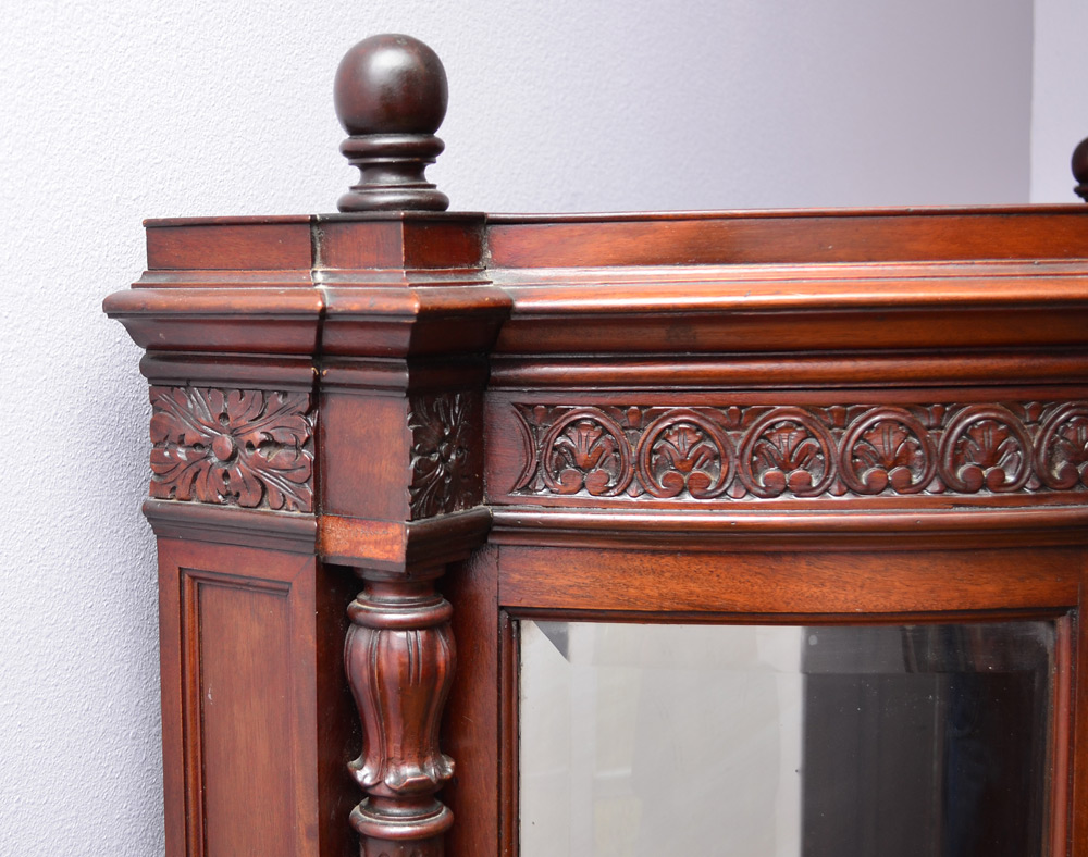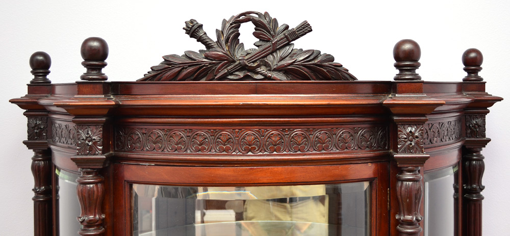 HIGH VICTORIAN MAHOGANY BOW FRONT CHINA CABINET: Carved all over, top with foliate crest and 4 ball finials. Beveled glass door and sides, 4 full column supports, lower carved panels. Upper interior with mirrored back, glass shelves, lower storage. 4 carved and turned legs. Measures 65'' h. x 44 3/4'' x 20 1/2''.