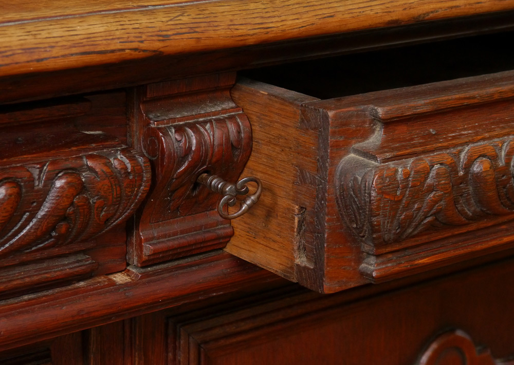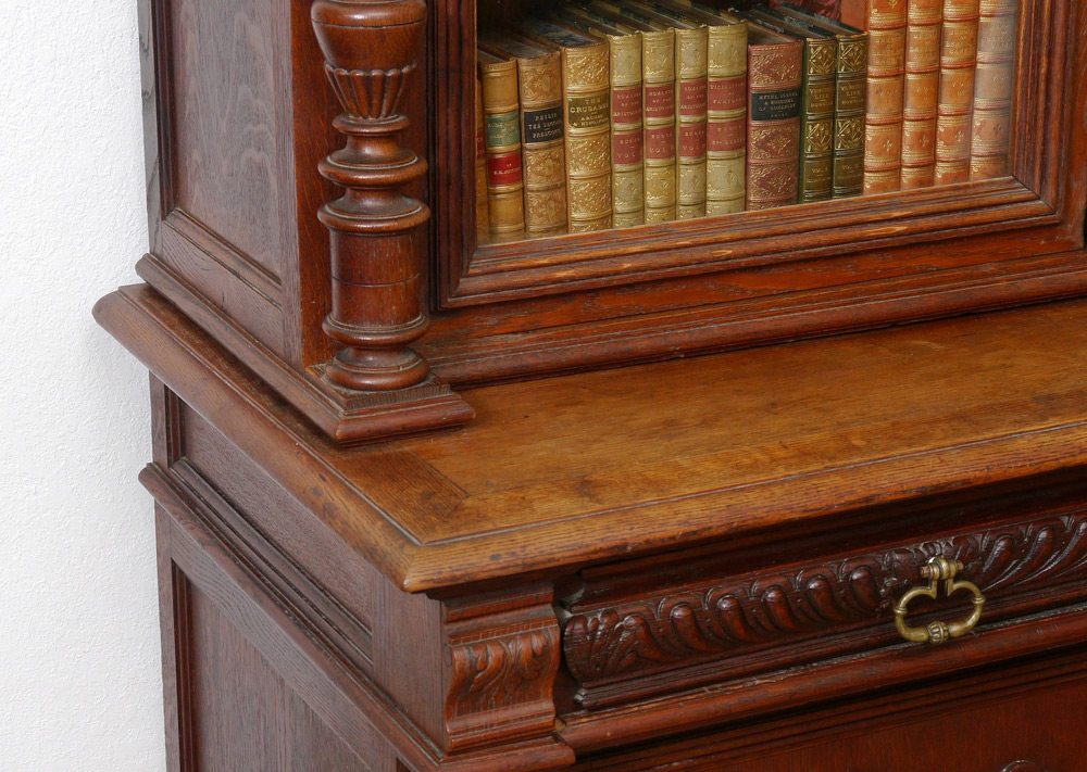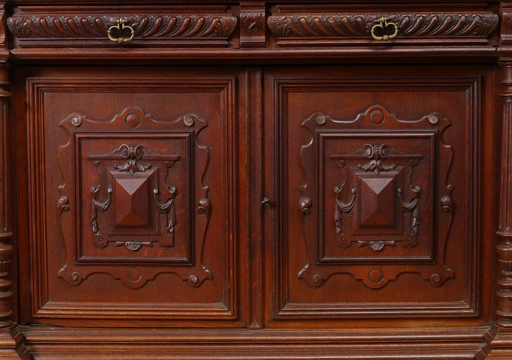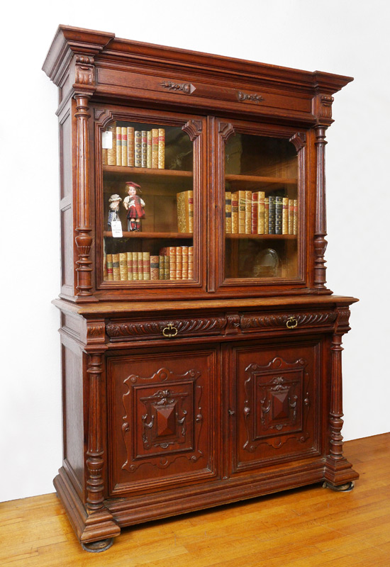 VICTORIAN CARVED SIDEBOARD: Top with shaped pediment and carved decoration, full fluted columns. 2 glass doors with 2 adjustable shelves. Base with 2 drawers over 2 carved panel doors with single shelf. Overall 82'' h. x 55'' x 24''.