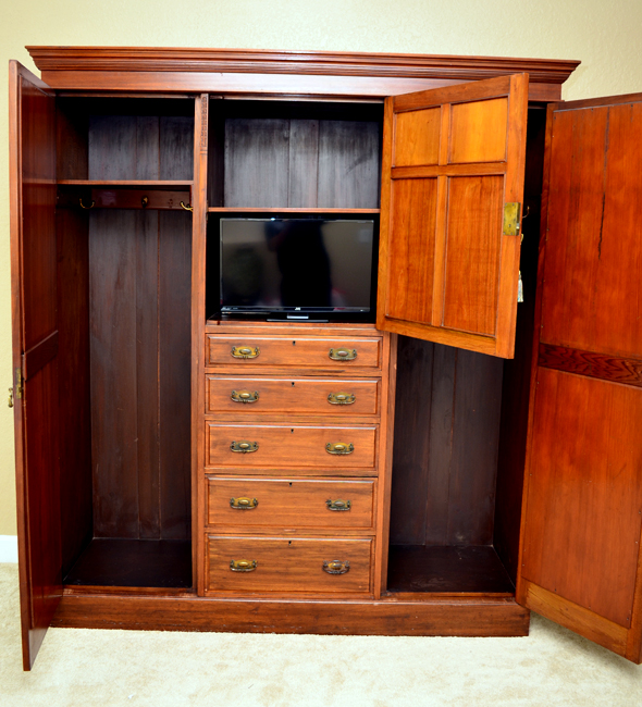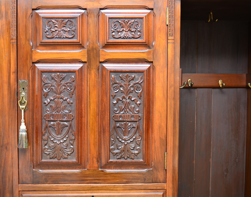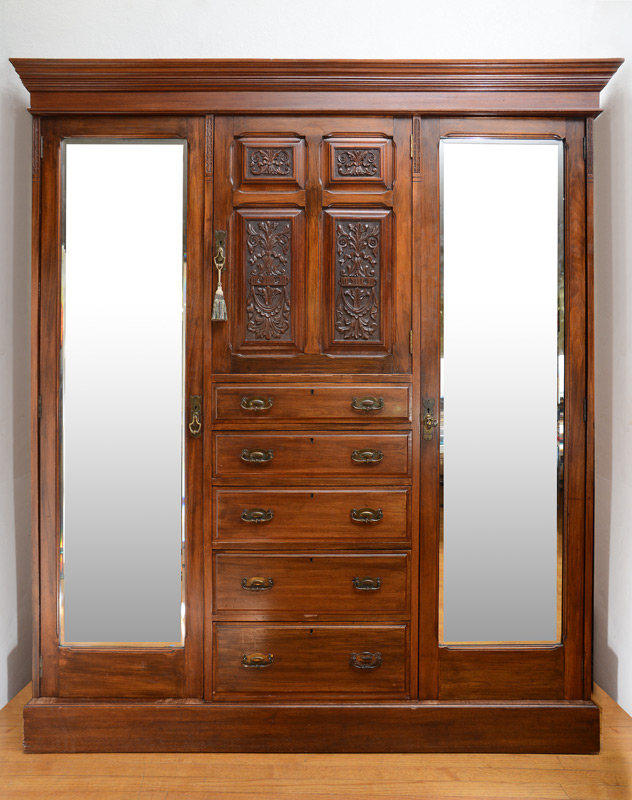 TURN OF THE CENTURY CARVED WALNUT ARMOIRE/ SHRANK: Center door with carved panels over 5 graduated drawers. Surmounted by beveled glass mirror doors. 81'' h. x 72 1/4'' x 20 1/2''