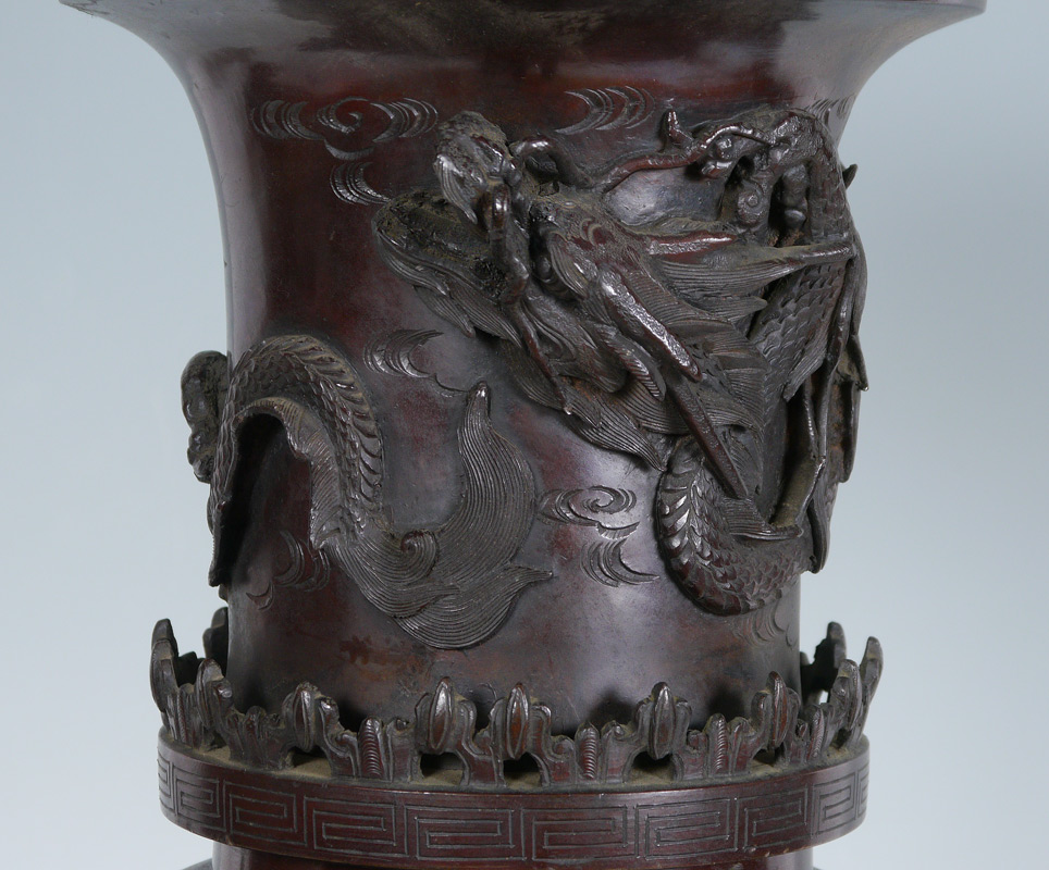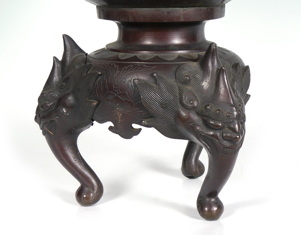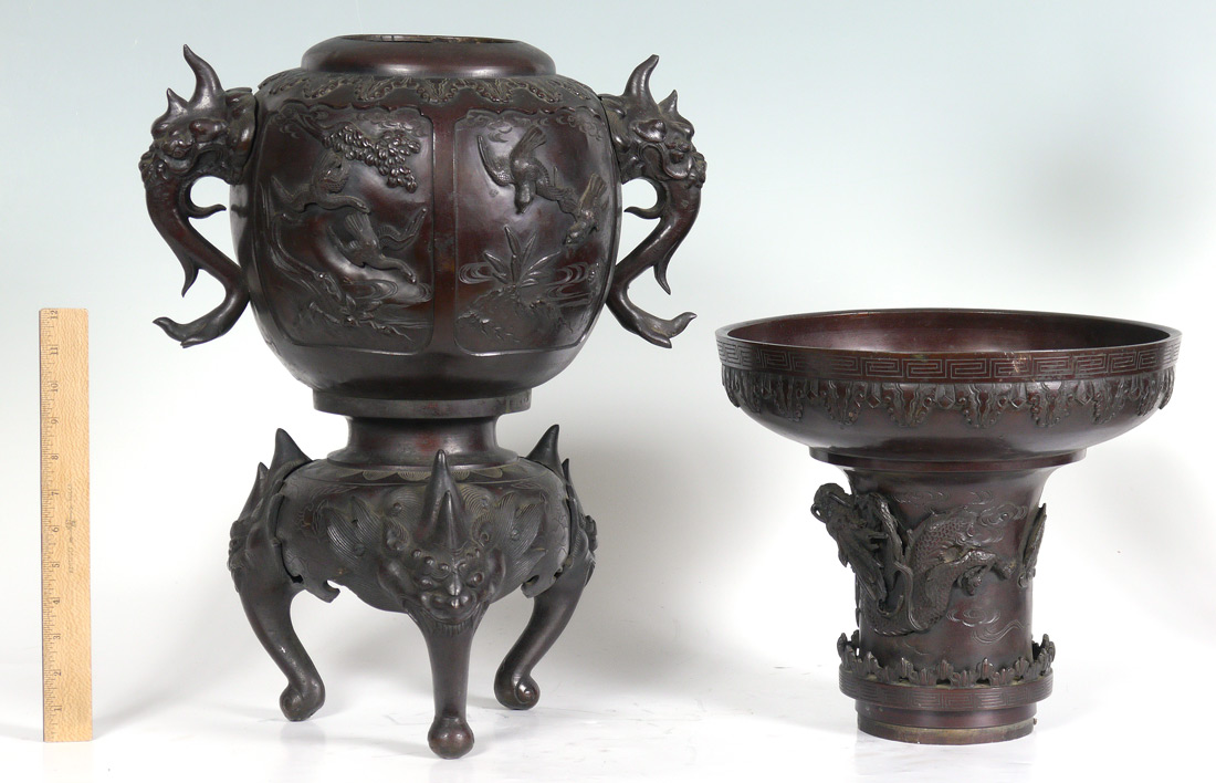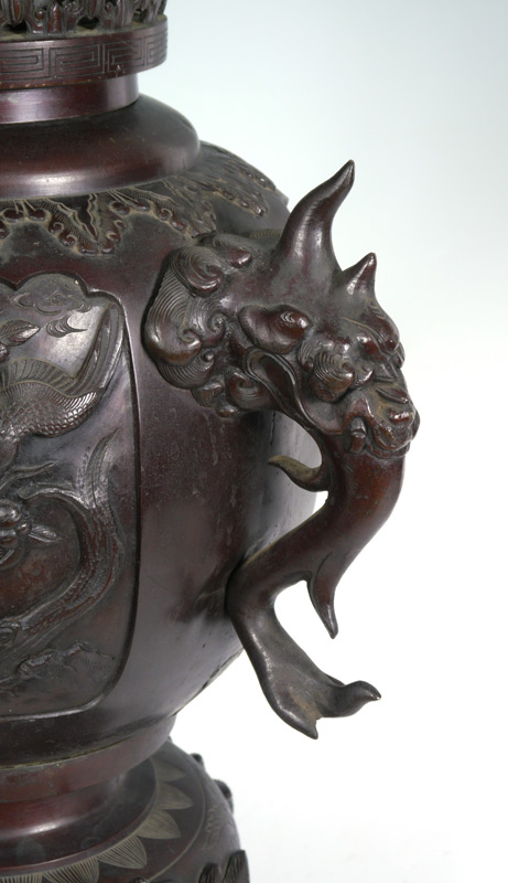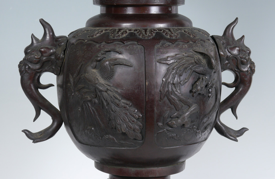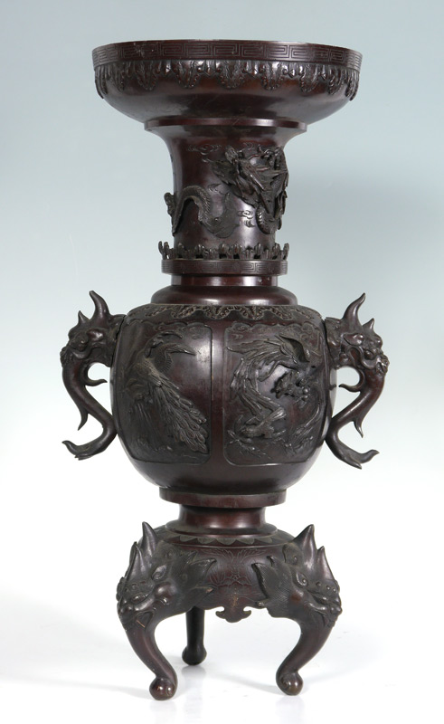 LARGE JAPANESE BRONZE CENSOR: Top section with flared rim, sides with dragon motifs. Body with applied figural elephant handles, panels featuring assorted birds. Base with 3 feet. 30'' tall.