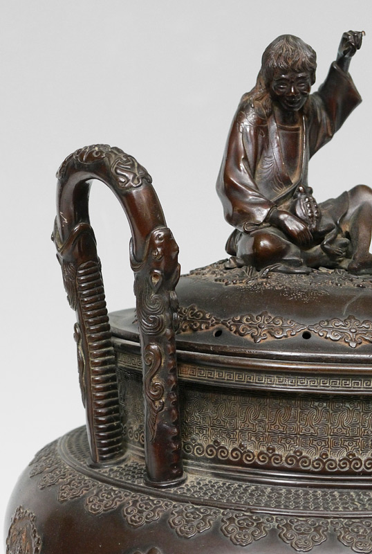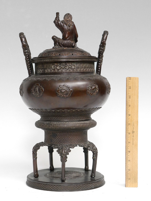 MEIJI BRONZE CENSOR WITH FIGURAL FINIAL: Double handle censor, body with medallion of the various signs of the year, figural handles. Body supported by 5 legs affixed to base. Signed under base. 19 1/2'' h. x 10 1/2''.