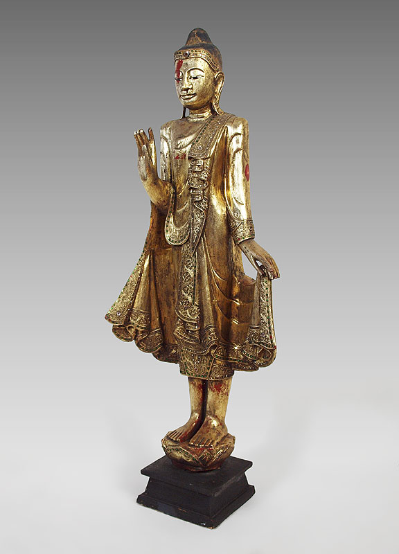 SILVER GILT CARVED WOOD BUDDHA: Embellished with mirror dots. Approx. 4.5 ft tall, overall.