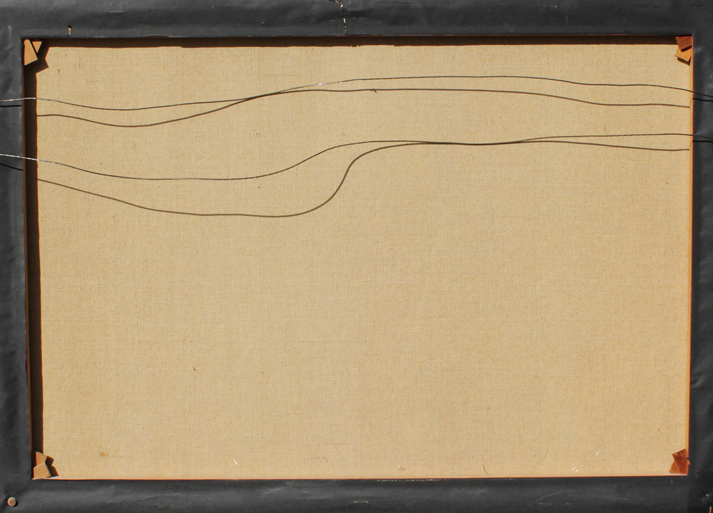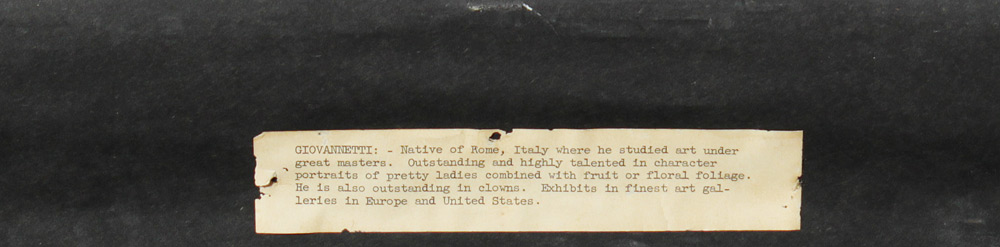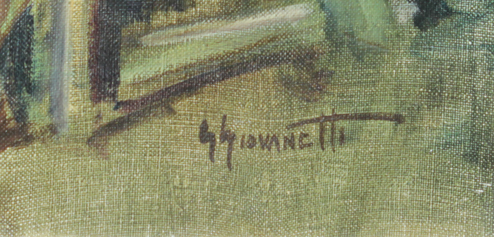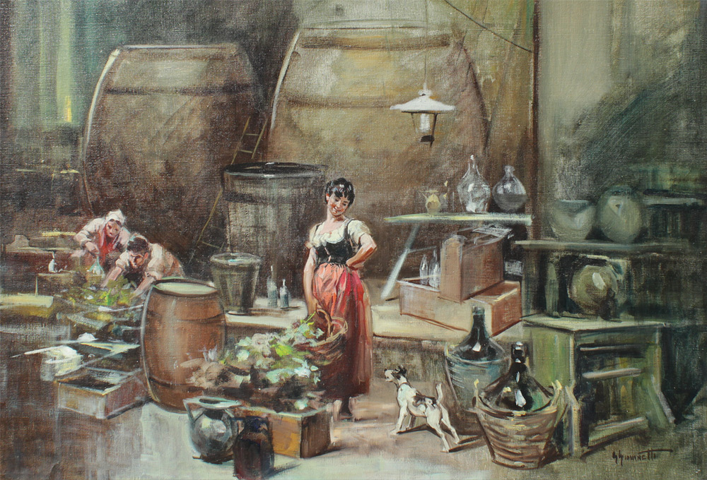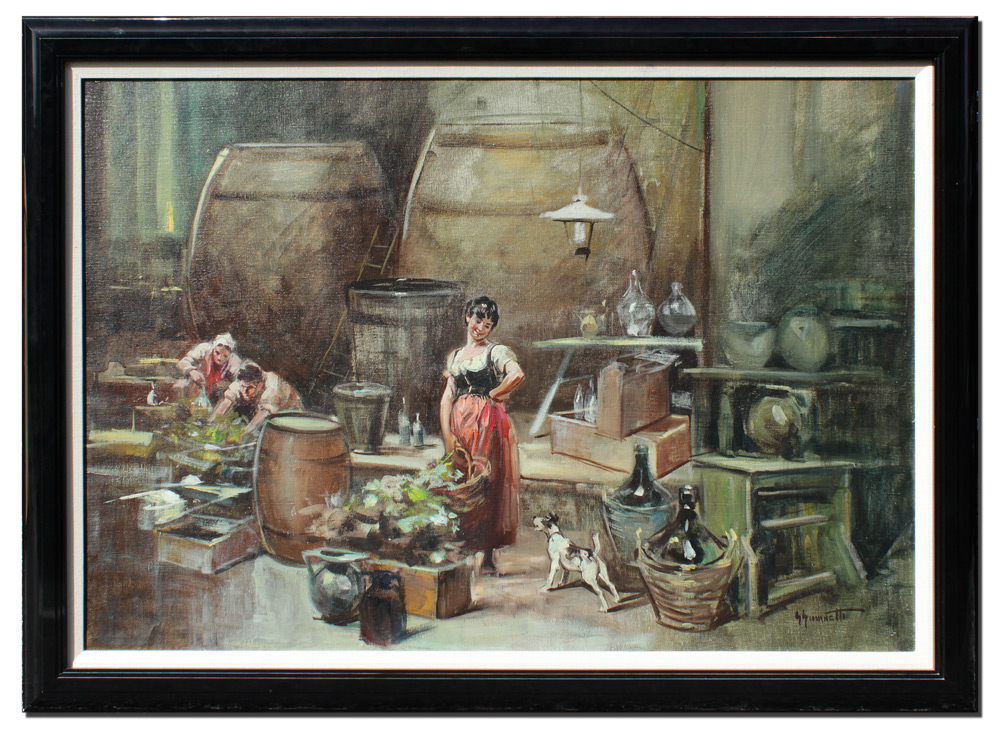 GIOVANETTI, Giordano, (Italian, 1906-1973): Scene at the Winery, with Workers, Maiden, and Dog, Oil/Canvas, 27'' x 39'', signed lower right, encased in contemporary black lacquer frame with minor wear 33'' x 44 1/2''.