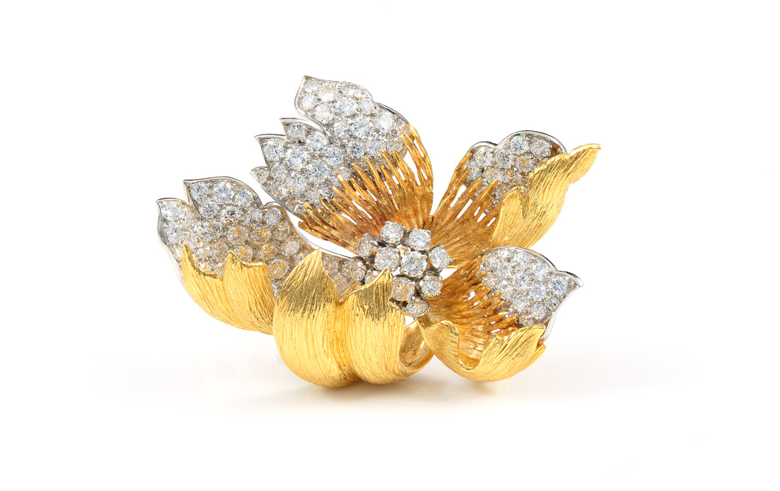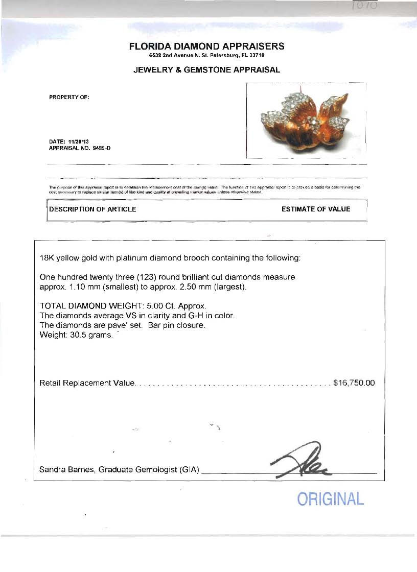 5.0 CT DIAMOND, PLATINUM & 18K GOLD FLOWER FORM BROOCH: 18K yellow gold and platinum sculptural brooch with 123 round brilliant pave set diamonds totaling approx. 5 Ct., averaging VS in clarity and G-H color. Bar pin closure. Length 2 1/8''. Weight 30.5 grams. Sold with current Florida Diamond Appraisers GIA graduates appraisal for $16,750.