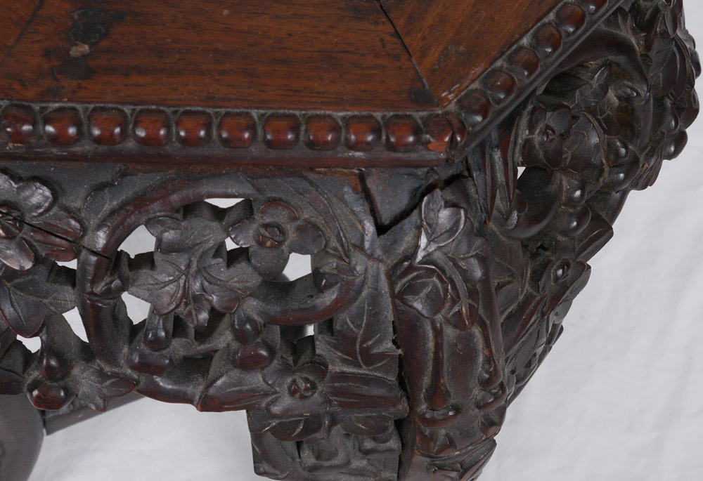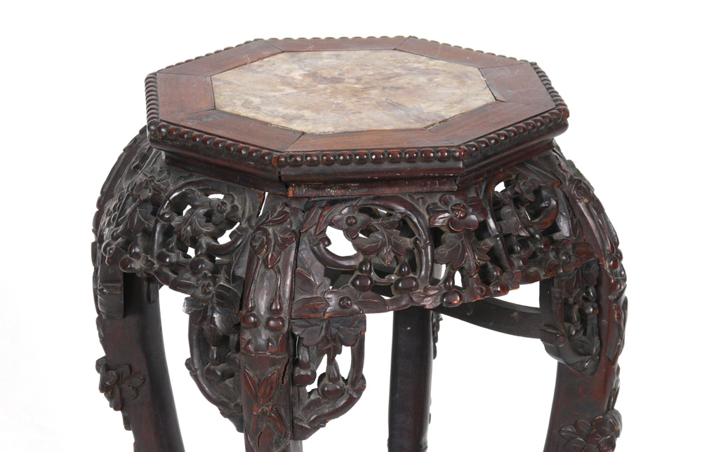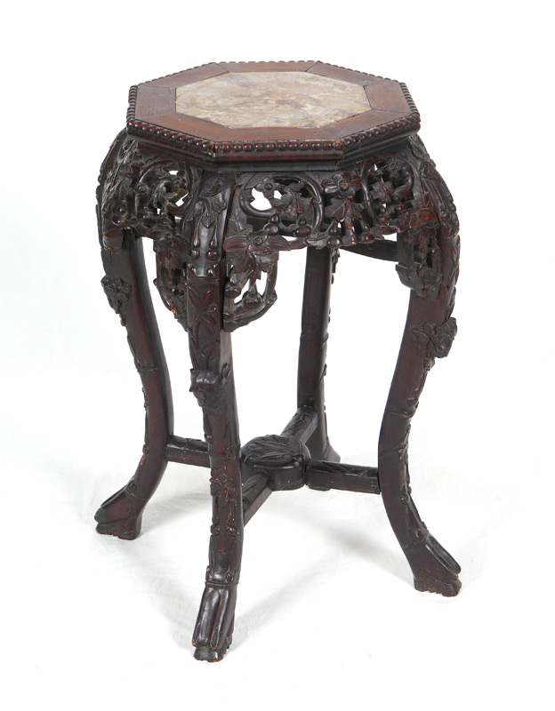 MARBLE TOP CARVED CHINESE PLANT STAND: Octagonal inset marble top, flared apron with pierced carved decoration. 24'' h. x 15''.