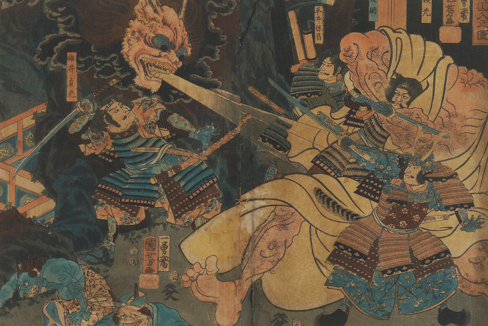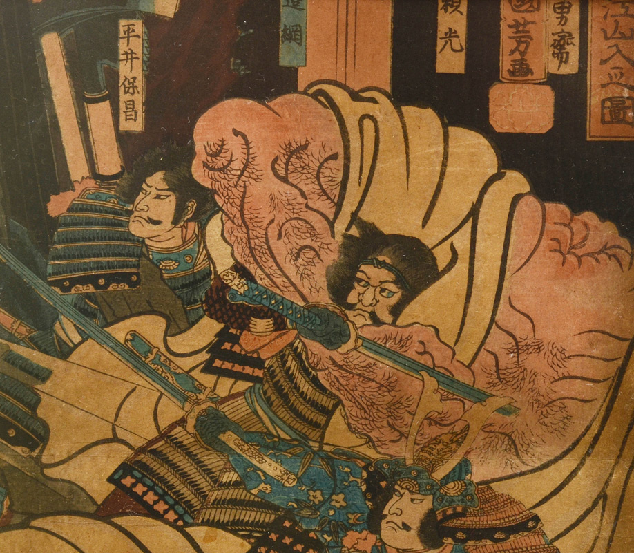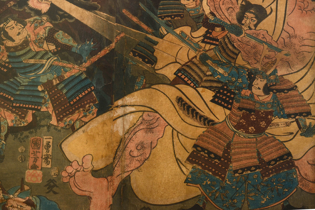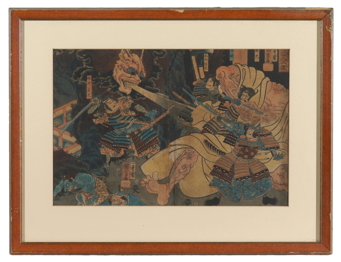 JAPANESE WOODBLOCK PRINT BY KUNIYOSHI OF SAMURAI AND DEMONS: Sight size 12 1/4'' x 18 1/2'', Diptych, Depicting a Battle Scene with Samurai, Demons, & Giants, encased in a worn wooden frame, not period 19 1/2'' x 25 1/2''.