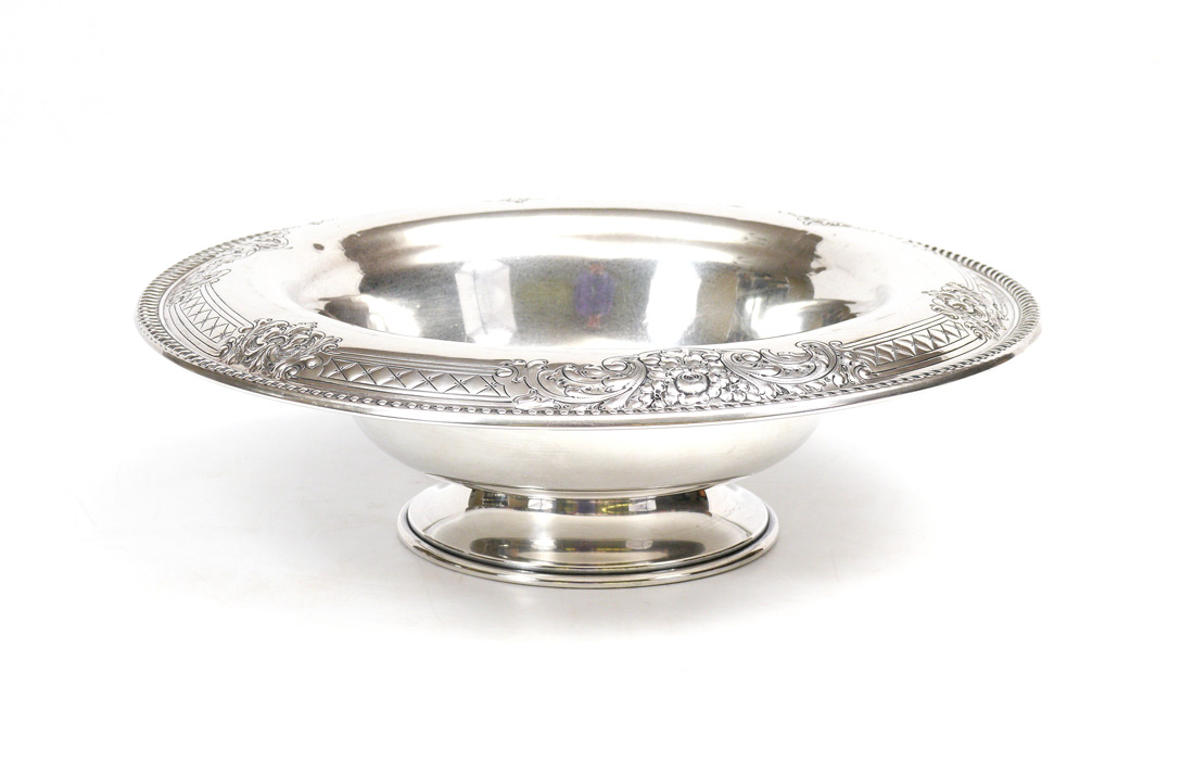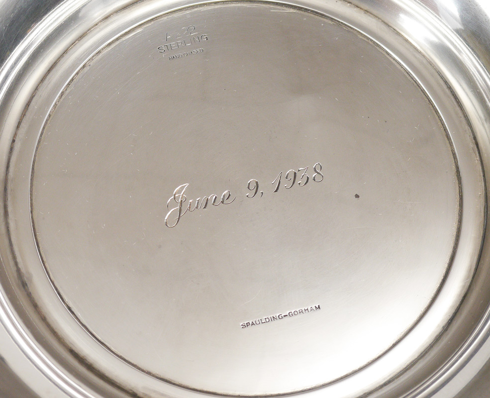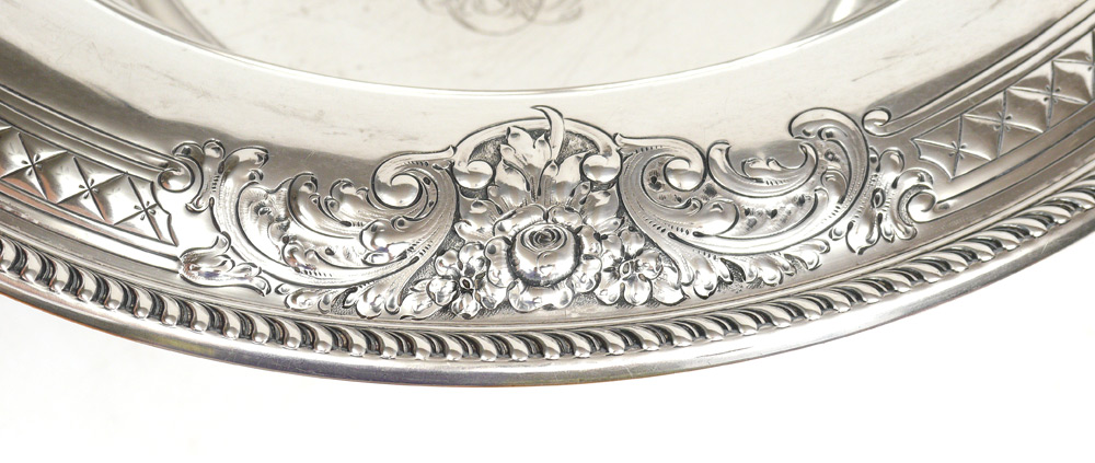 GORHAM SPAULDING REPOUSSE STERLING CONSOLE BOWL: On raised pedestal, the bowl has handchased floral and diamond cross motifs to rolled rim with gadroon border to edge. 14'' dia. x 4''h. 29.0 troy ounces