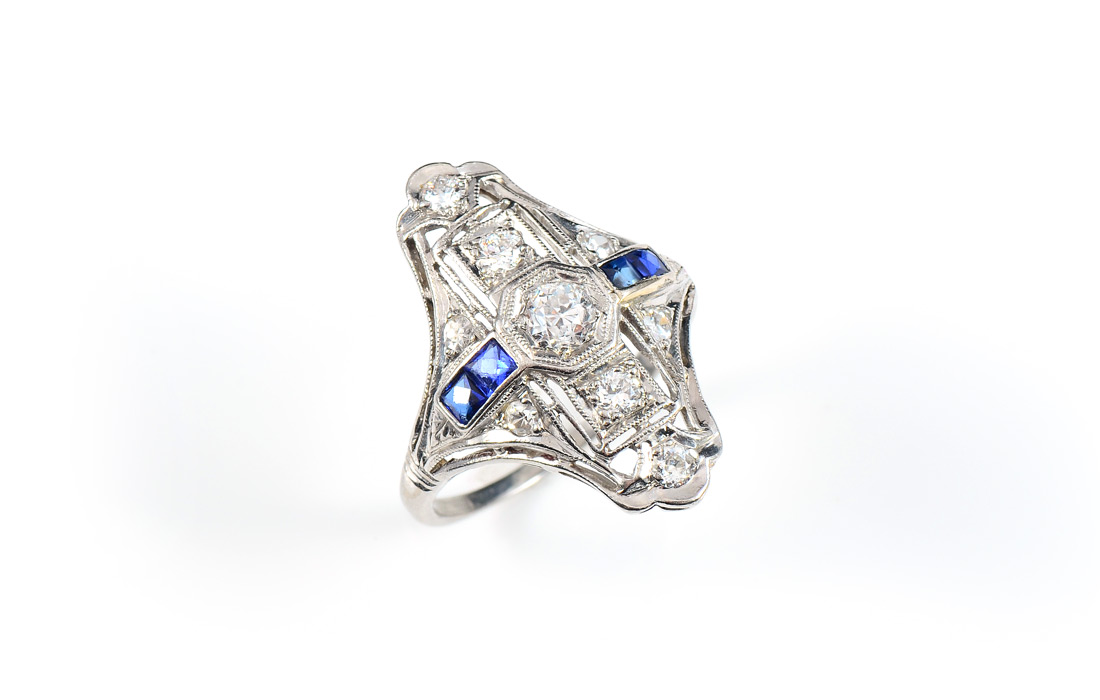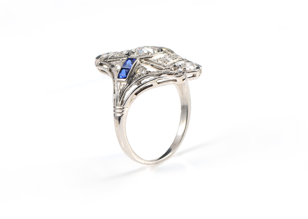 ART DECO PLATINUM DIAMOND & SAPPHIRE FILIGREE RING: 5 old European round cut diamonds and 4 round single cut diamonds total approx. .50 Ct., rated VS in clarity and G-H in color. The diamonds are bead set. Three square French cut synthetic sapphires and one square calibre' cut natural sapphire. The sapphires are channel set. Weight: 4.2 grams. Size: 5.5