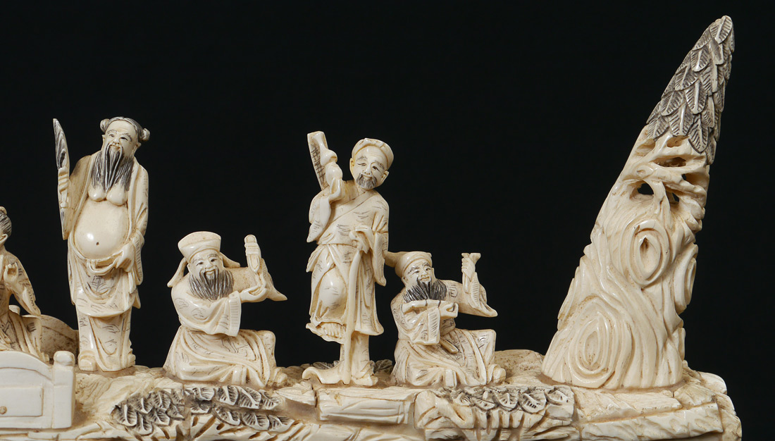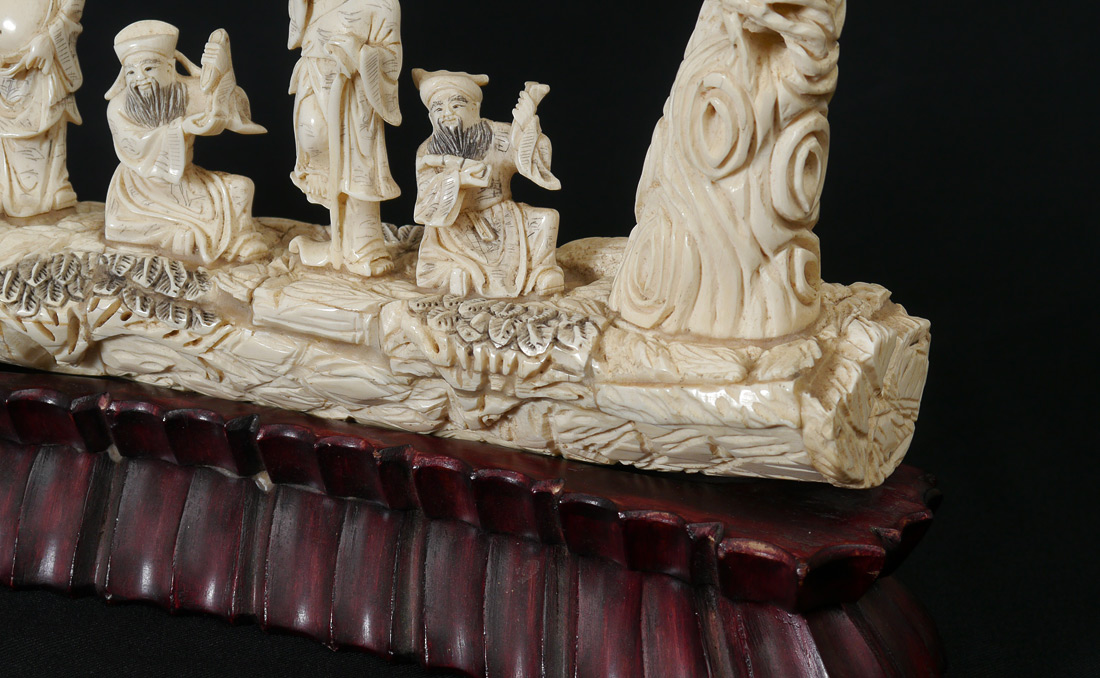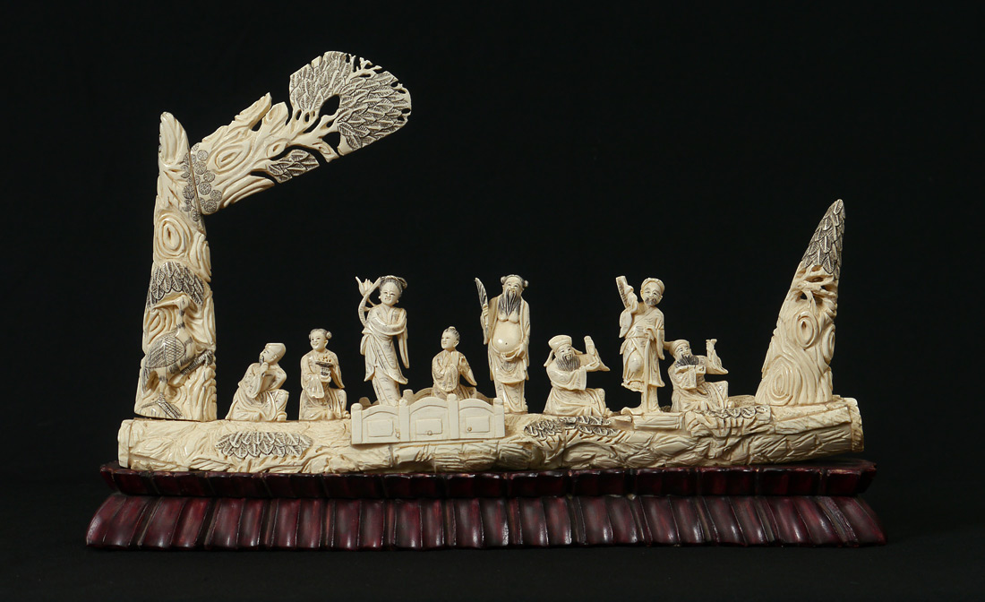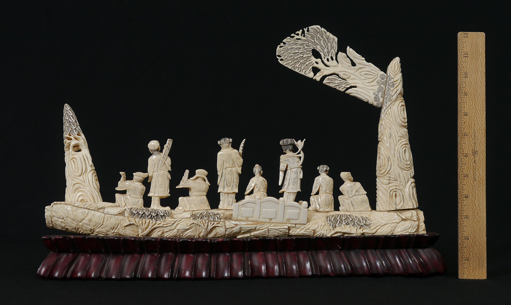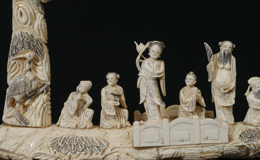 CARVED IVORY BRIDGE FIGURAL GROUPING: An eclectic cast of carved ivory figures to include a crane and tree, seated and standing oriental figures and a bush, all affixed to clad ivory bridge. Bridge overall measures 10 3/4'' h. x 18 1/2'' x 3''. Sold with carved wood base, 2'' h. x 19 3/4'' x 4''.