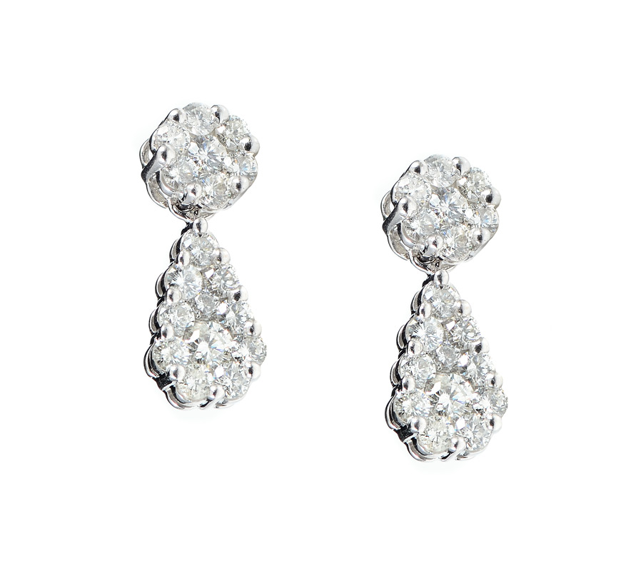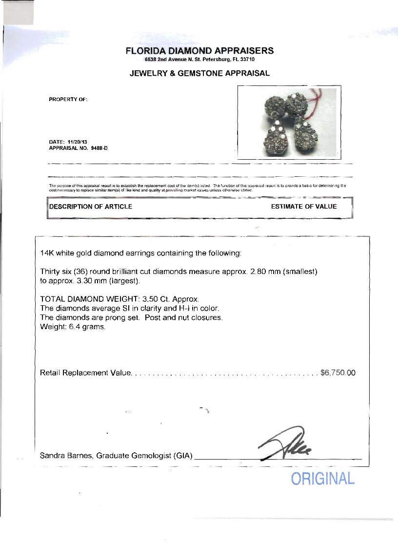 3.50 CT DIAMOND DROP EARRINGS: 14K White gold earrings of 36 round brilliant cut diamonds totaling approx. 3.50 Ct., averaging SI in clarity and H-I color. Post and nut closures. Length 1''. Weight 6.4 grams. Sold with current Florida Diamond Appraisers GIA graduates appraisal for $6,750.