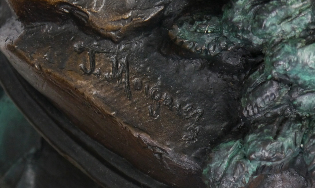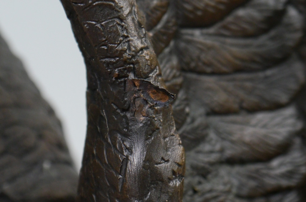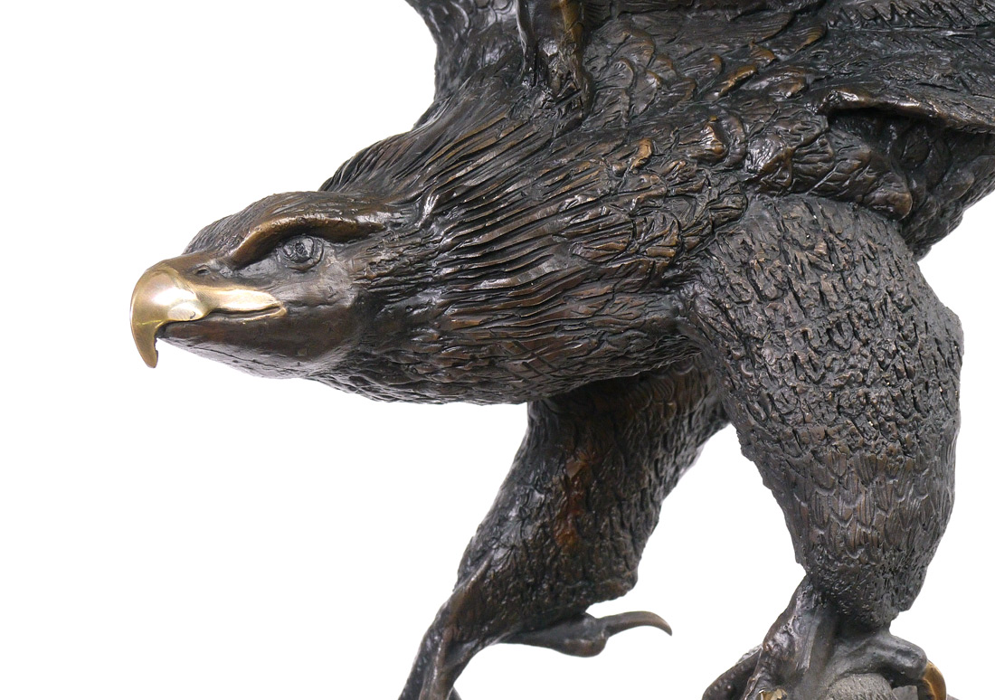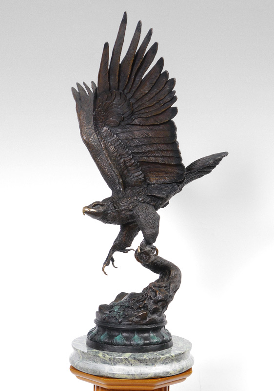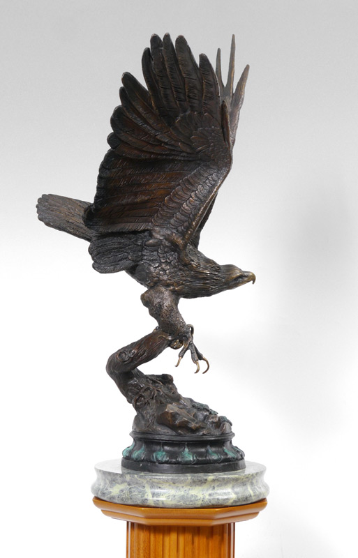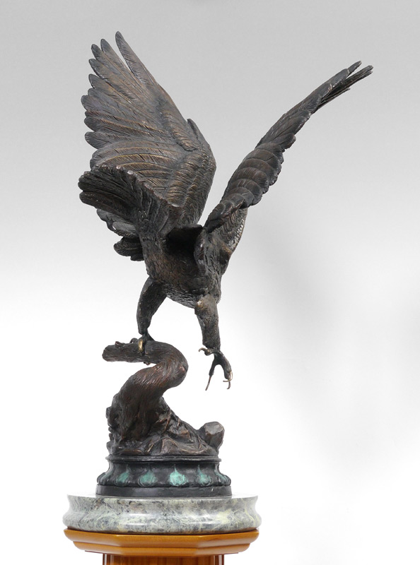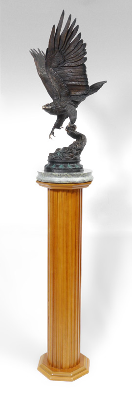 LARGE EAGLE BRONZE AFTER MOIGNIEZ: 30'' h., x 19'' w., affixed to a polished beveled marble plinth which adds another 2'' to the height, and is 12'' in diameter. Sold together with the fluted wood pedestal, 42'' tall.