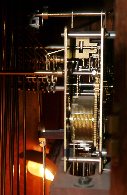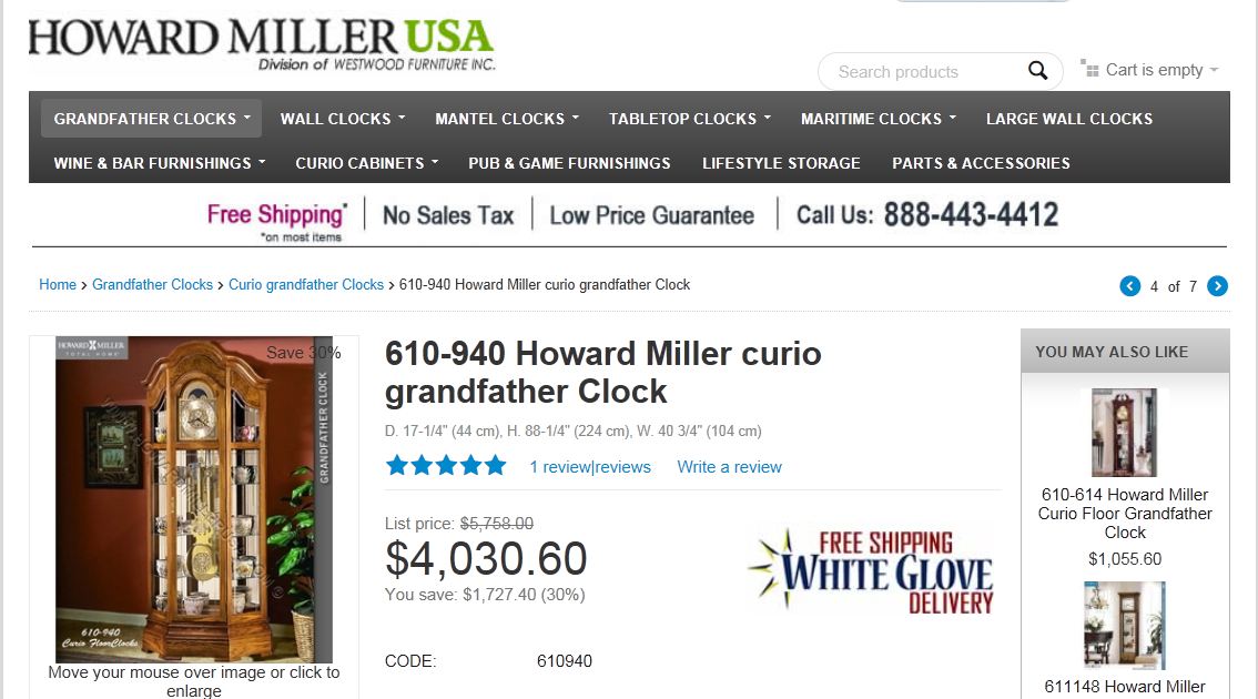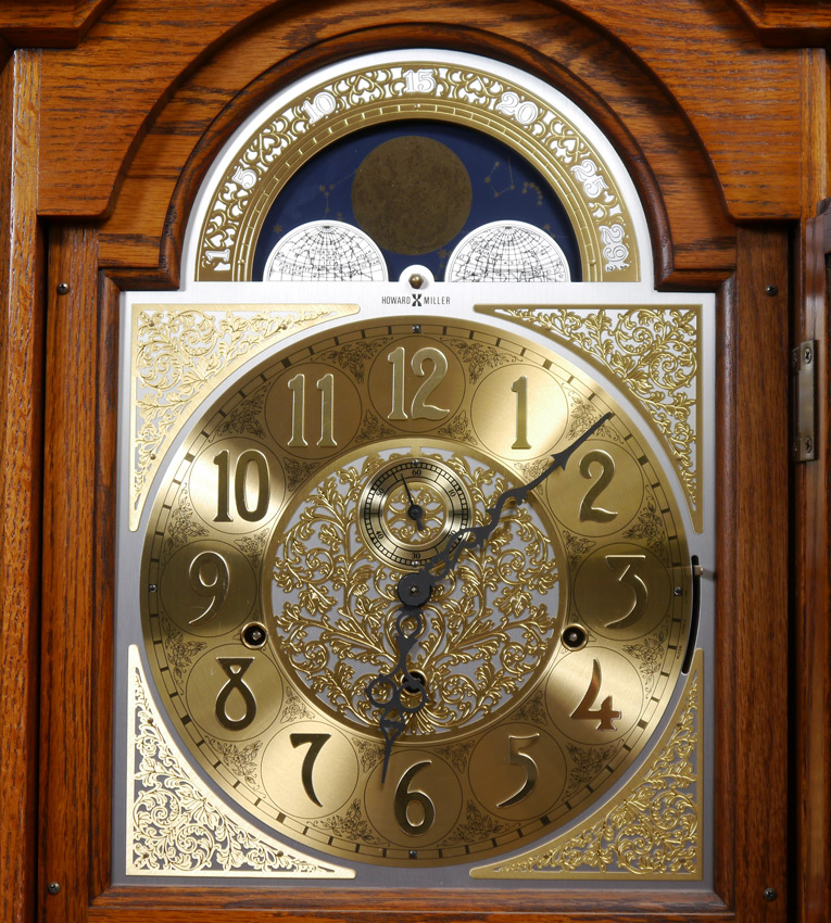 HOWARD MILLER MAJESTIC CURIO GRANDFATHER CLOCK: Oak case. Arched pediment, moon phase dials, cable driven, triple chime movement. Illuminated case with 6 shelves for display. Retails for $5,125. Measures 82'' x 36'' x 15''