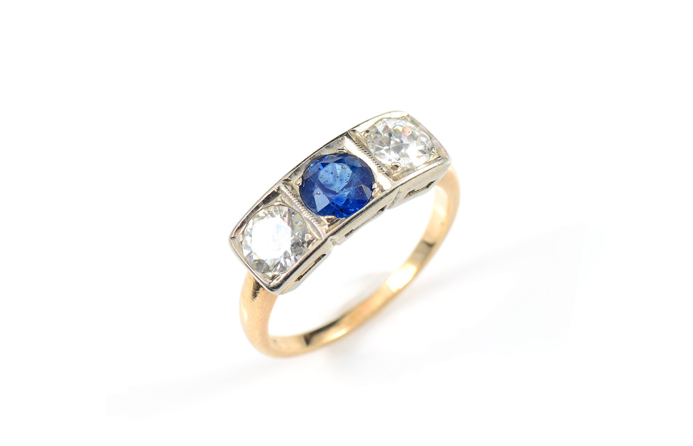 VINTAGE DIAMOND & SAPPHIRE 3 STONE RING: 14K yellow gold ring contains 2 round brilliant cut diamonds totaling approx. .75 Ct., Rated SI1-SI2 in clarity and I-J in color. At the center is one round mixed cut sapphire, approx. .50 Ct. Rated VS in clarity (Type II) B in Hue, 6 in Tone and 3 in Saturation. The diamonds and sapphire are prong set. Weight: 3.1 grams. Size: 6