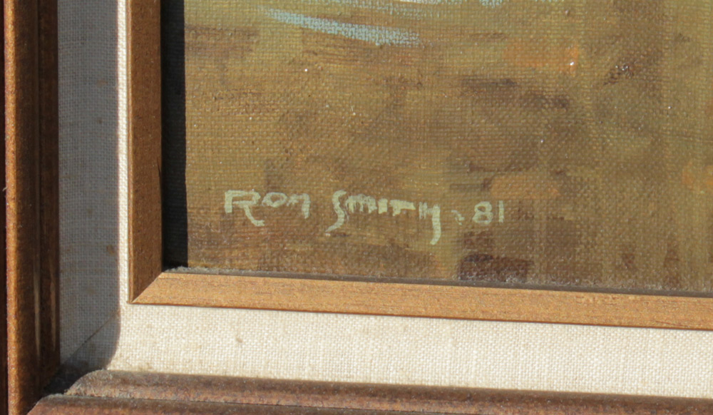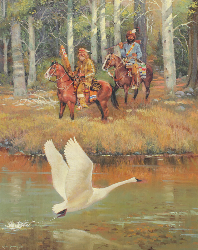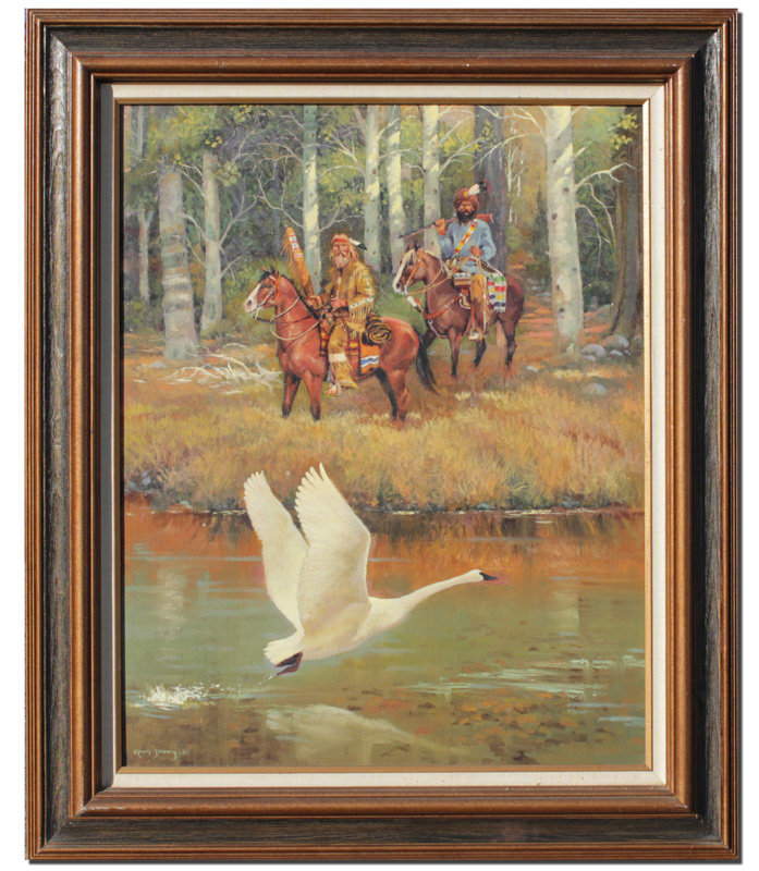 SMITH, Ron, (American, 20th Century): Mountain Men on Horseback, Startling a Swan into Flight, Oil/Canvas, 30'' x 24'', signed lower left, dated '81, encased in original wood frame with minor wear 33'' x 32'', acquired from personal friend and former classmate of Smith's.