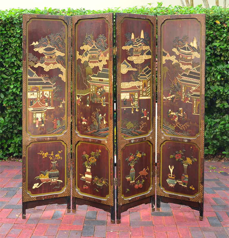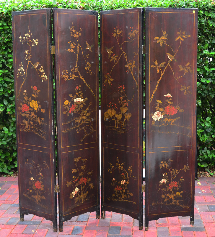 4 PANEL ORIENTAL COROMANDEL SCREEN: One side with stone inlay and paint decoration of outdoor genre scenes, verso paint decorated with bird and branches motifs. Each panel with 72'' x 18''.