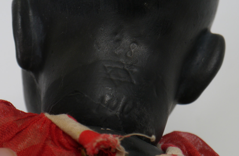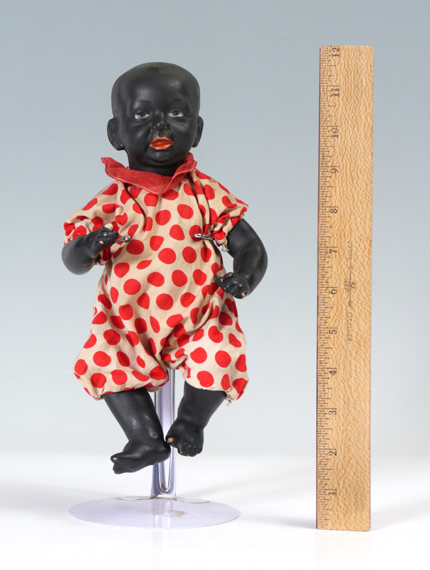 KAMMER & RHINEHARDT KAISER BLACK BABY DOLL: Bisque head marked 28 with a star. All molded face with painted eyes and happy smile. Bent limb baby body. Length 10''.
