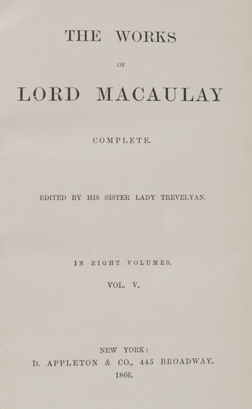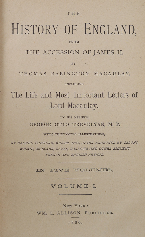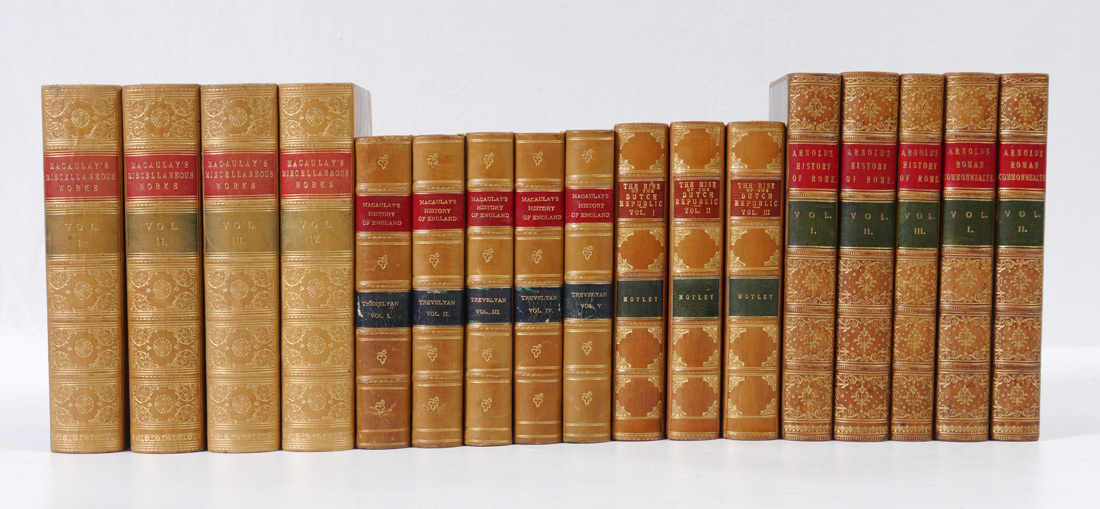 17 VOLUME HISTORICAL ANTIQUARIAN BOOKS: 17 total volumes to include 1) 4 volumes ''Macauley's Miscellaneous Works'', 3/4 calf, 1866, D. Appleton & Co., New York. 2) 5 volumes ''Macauley's History of England'', half calf, 1886, W. Allison, New York. 3) Motley, John, 3 volumes ''The Rise of the Dutch Republic'', undated, David McKay, Philadelphia. 4) 5 volumes ''Arnold's Roman Commonwealth'' & ''Arnold's History of Rome'', full cover, 3 are school copies, 1857 & 1869, London.