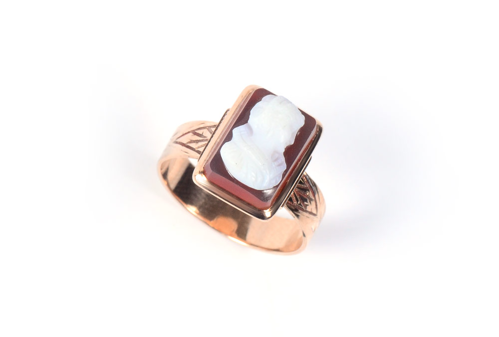 ROSE GOLD VICTORIAN CAMEO RING: 14K rose gold ring centering one hardstone portrait cameo. The shank is engraved. Weight: 4.0 grams Size: 6.5 grams.