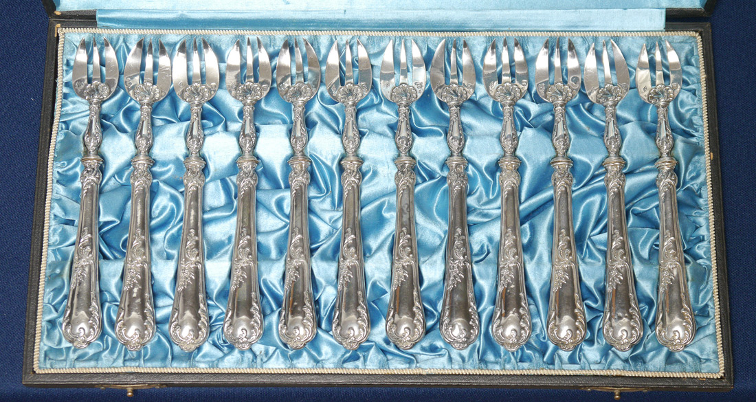 12 V. BOIVIN FRENCH SILVER OYSTER FORKS: Hallmarks for V. Boivin, Paris, 800 silver. Floral motif, each 6'' long. Sold with original Dickhoff & Salm, Amsterdam, presentation case, 1 1/4'' h. x 12 3/4'' x 7''.