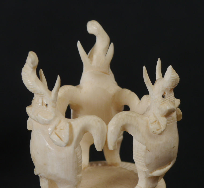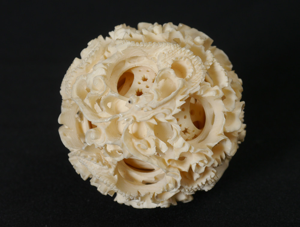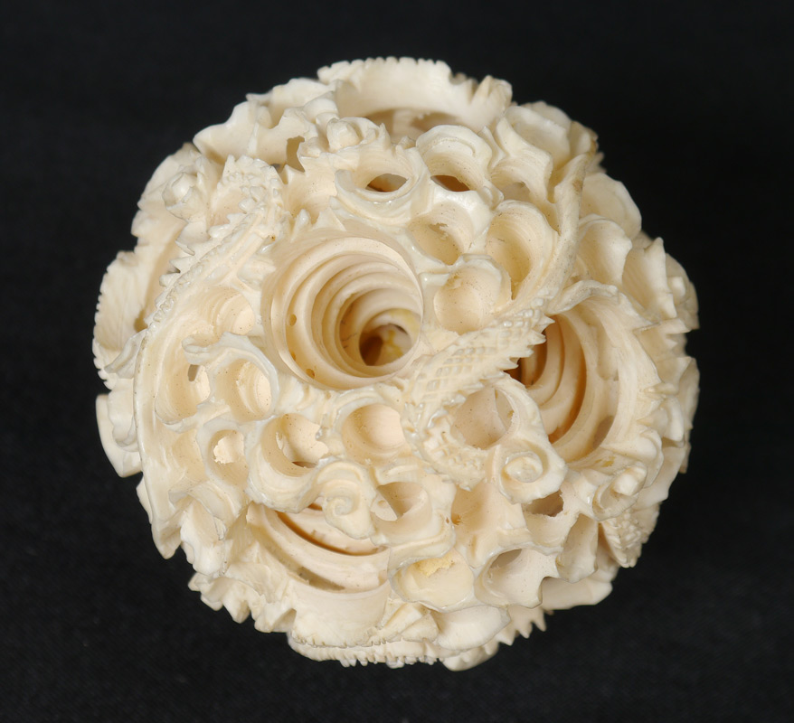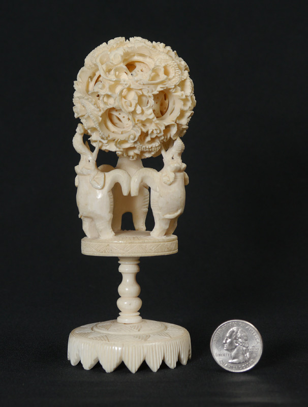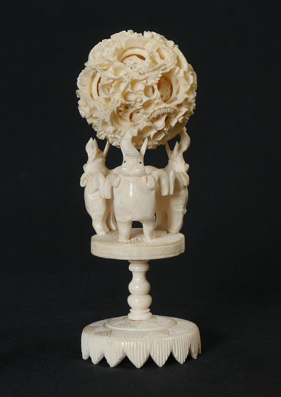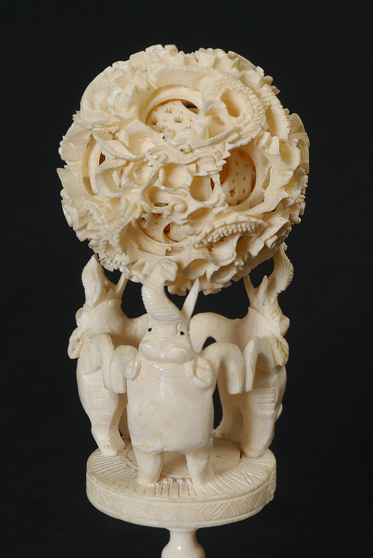 CARVED IVORY MYSTERY BALL & STAND: Mystery ball with dragon motif, at least 11 levels, 2 1/4'' dia. 3 figural elephant stand , 4 1/2'' h. x 2 3/8''. Carved wood stand 1'' x 4'' x 4''.