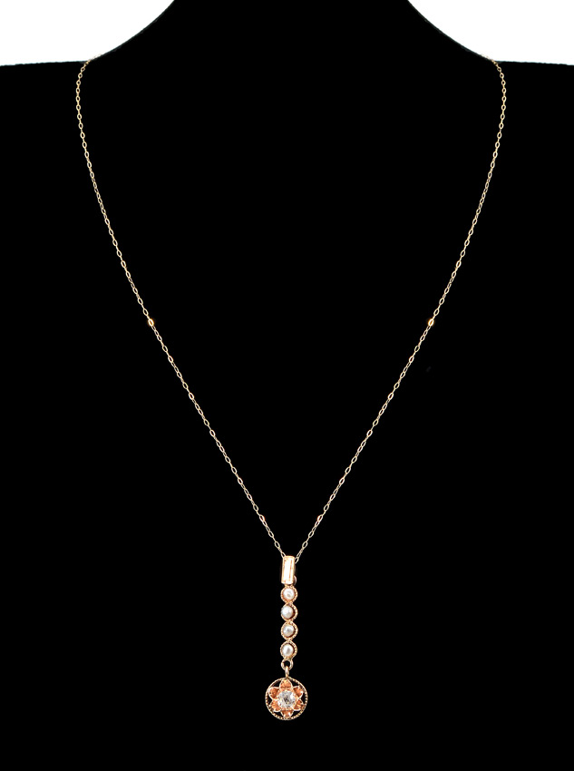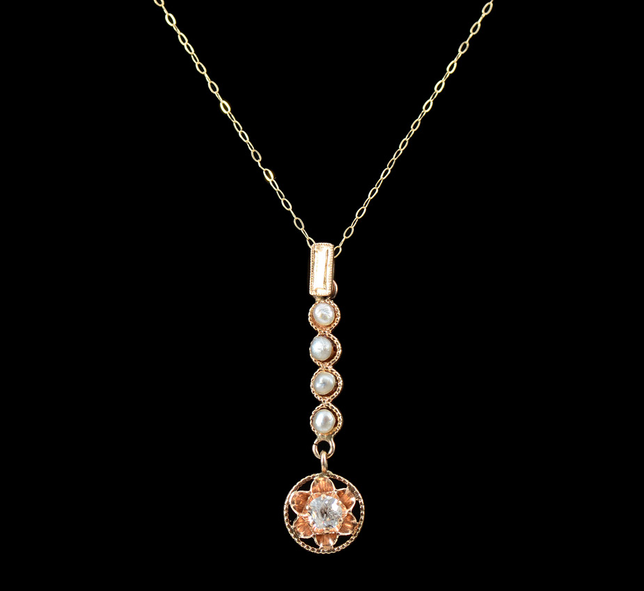 14K GOLD PEARL AND DIAMOND LAVALIER NECKLACE: The slide pendant having a line of 4 pearls ending in an approx. .28 Ct old mine cut diamond. Chain measure 16'', the pendant 1.5''. Weight 1.6 grams.