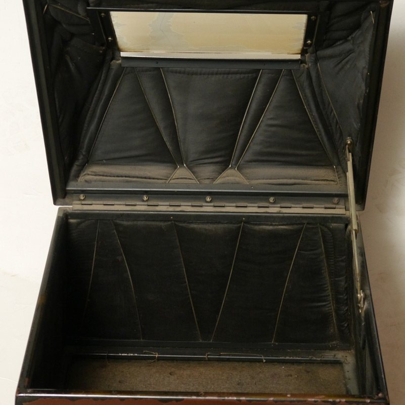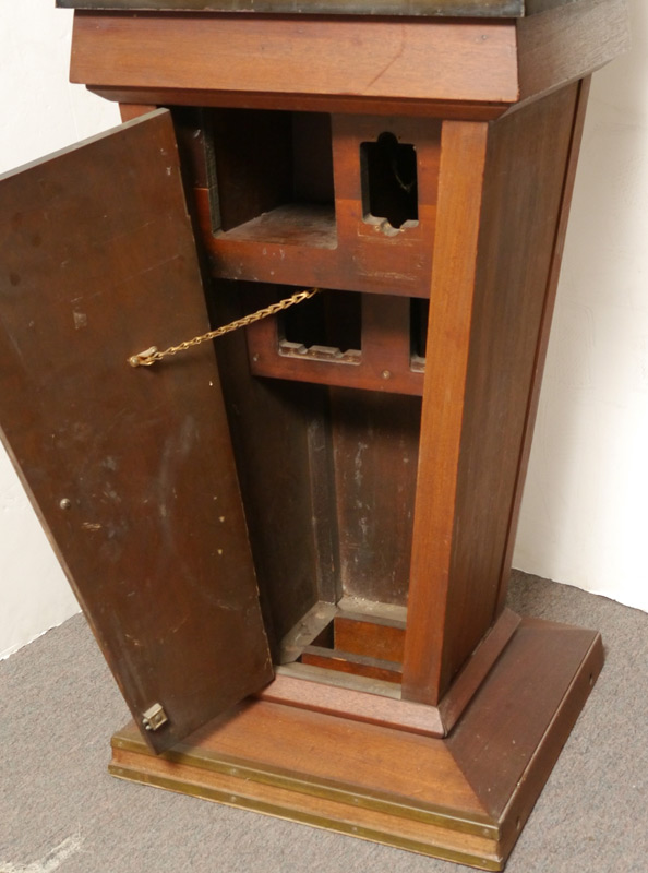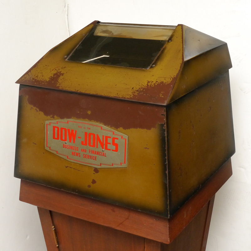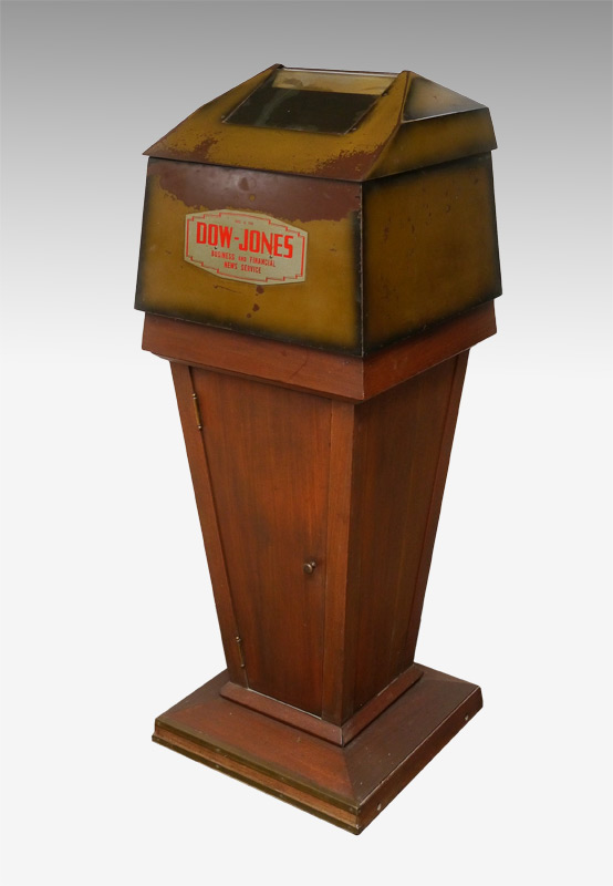 DOW JONES STOCK TICKER FLOOR CASE: Mid 20th century, metal case with painted finish, locking hinged lid with window, front plaque reads ''This is the Dow Jones Business and Financial News Service''. Tapered wood base with single door. Overall measures 51 1/2'' h. x 19 1/4'' x 19''.