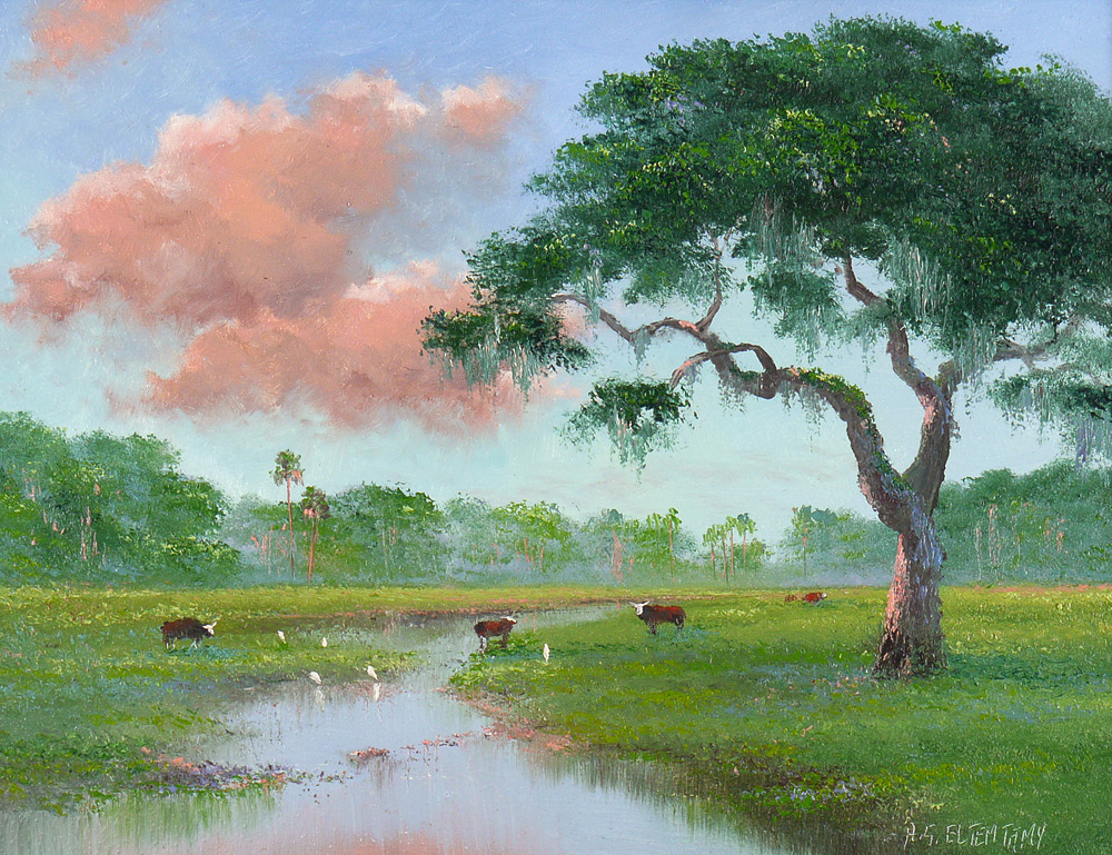 ELTEMTAMY, Ahmed, (American, 20th Century): Florida Cattle Landscape, Oil/Masonite, signed lower right, student of Florida Highwaymen artist Sam Newton. 12'' x 16'', framed 21 1/4'' x 17 1/4''.